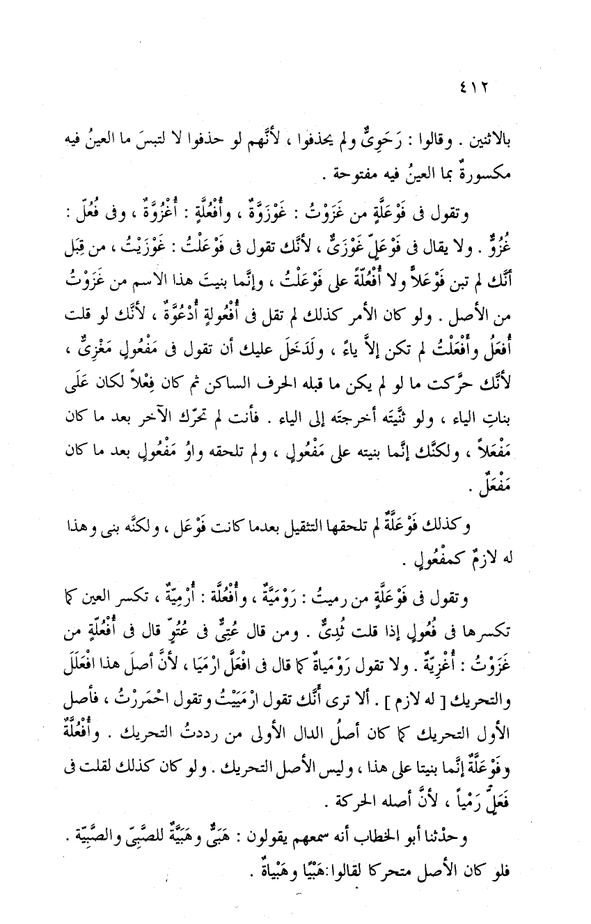 وتقول في فوعلةٍ من غزوت: غوزوةٌ، وأفعلةٍ: أغزوةٌ، وفي فعل: غزوٌّ. ولا يقال في فوعلٍ غوزىٌّ، لأنك تقول في فوعلت: غوزيت، من قبل أنك لم تبن فوعلاٌ ولا أفعلة على فوعلت، وإنما بنيت هذا الاسم من غزوت من الأصل. ولو كان الأمر كذلك لم تقل في أفعولةٍ أدعوةٌ، لأنك لو قلت أفعل وأفعلت لم تكن إلا ياءً، ولدخل عليك أن تقول في مفعولٍ مغزىٌّ، لأنك حركت ما لو لم يكن ما قبله الحرف الساكن ثم كان فعلاً لكان على بنات الياء، ولو ثنيته أخرجته إلى الياء. فأنت لم تحرك الآخر بعد ما كان مفعلاً، ولكنك إنما بنيته على مفعولٍ، ولم تلحقه واو مفعولٍ بعد ما كان مفعلٌ.