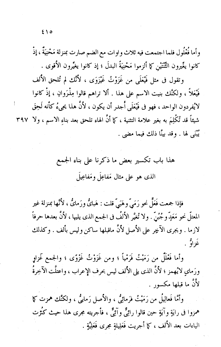 الذي هو على مثال مفاعل ومفاعيل فإذا جمعت فعلٌّ نح رمىٍ وهبىٍ قلت: هبايٌ ورمايٌ، لأنها بمنزلة غير المعتل نحو معدٍ وجبنٍ. ولا تغير الألف في الجمع الذي يليها، لأن بعدها حرفاً لازما. ويجري الآخر على الأصل لأن ما قبلها ساكن وليس بألف. وكذلك غزاوٌ.