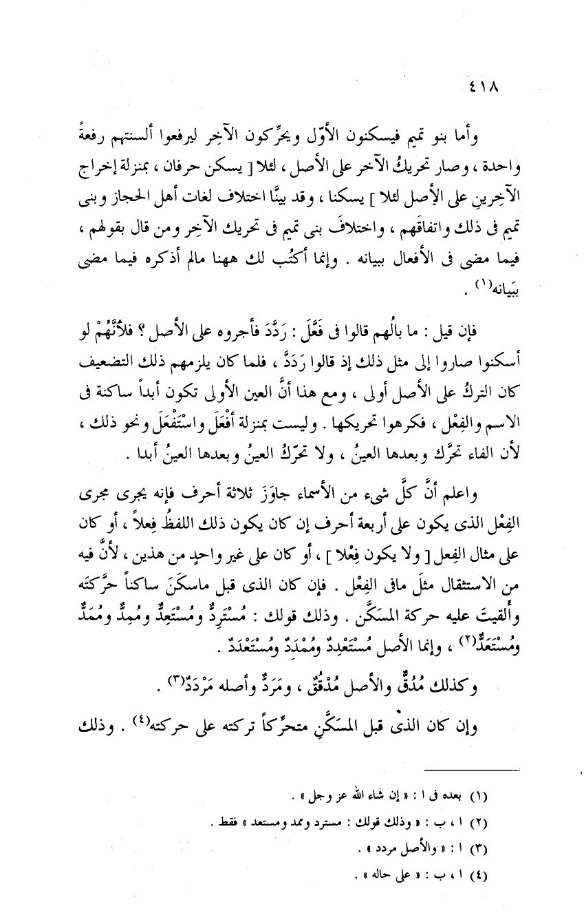 واعلم أن كل شيء من الأسماء جاوز ثلاثة أحرف فإنه يجري مجرى الفعل الذي يكون على أربعة أحرف إن كان يكون ذلك اللفظ فعلاً، أو كان على مثال الفعل ولا يكون فعلاً، أو كان على غير واحدٍ من هذين، لأن فيه من الاستثقال مثل ما في الفعل. فإن كان الذي قبل ما سكن ساكناً حركته وألقيت عليه حركة المسكن. وذلك قولك: مستردٌّ ومستعدٌّ وممدٌّ وممدٌّ ومستعدٌّ، وإنما الأصل مستعددٌ وممددٌ ومستعددٌ.