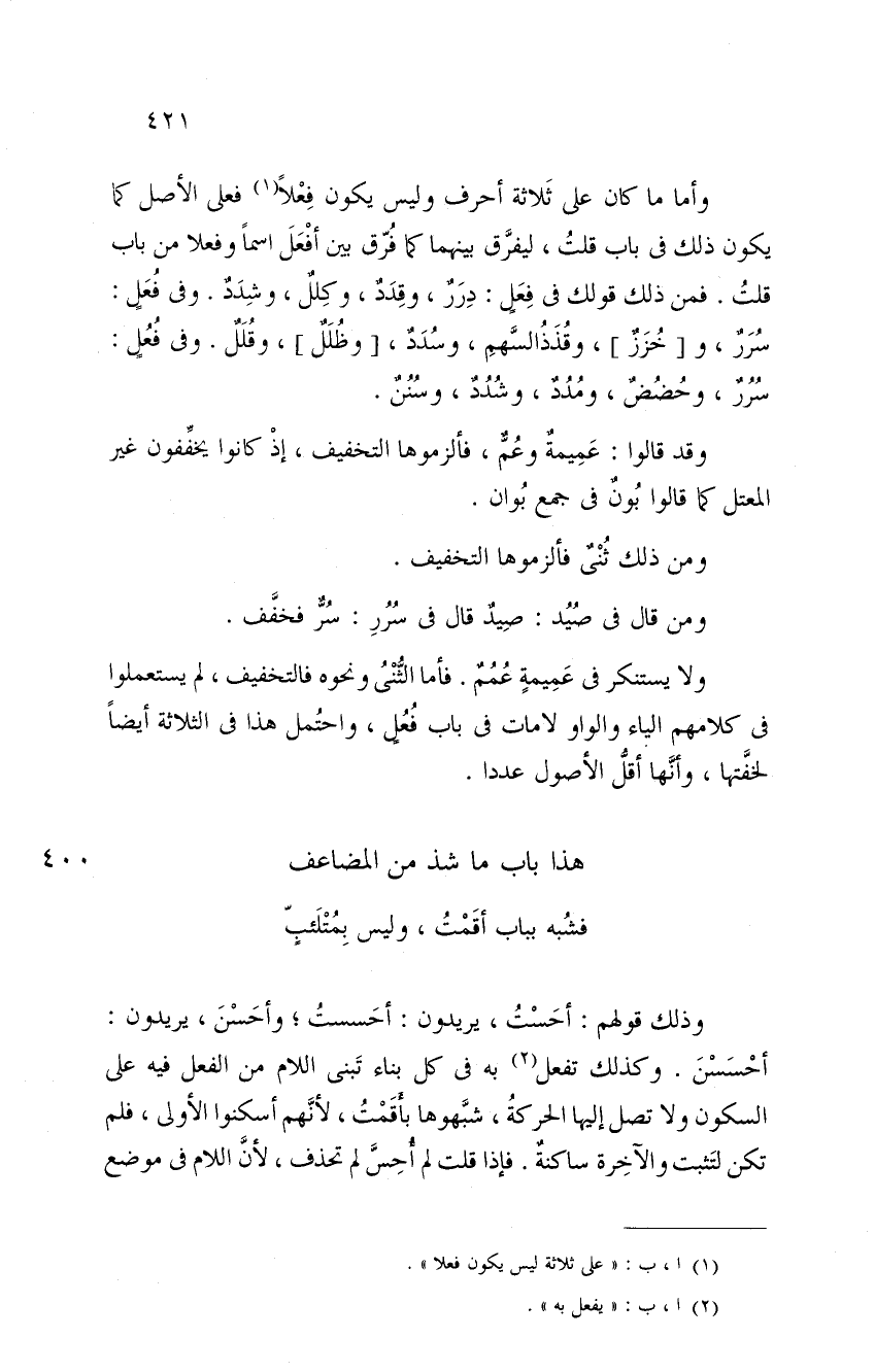 وأما ما كان على ثلاثة أحرف وليس يكون فعلاً فعلى الأصل كما يكون ذلك في باب قلت، ليفرق بينهما كما فرق بين أفعل اسماً وفعلاً من باب قلت. فمن ذلك قولك في فعلٍ: دررٌ، وقددٌ، وكللٌ، وشددٌ. وفي فعلٍ: سررٌ، وخززٌ، وقذذ السهم، وسددٌ، وظللٌ، وقللٌ. وفي فعلٍ: سررٌ، وحضضٌ، ومددٌ، وبللةٌ، وشددٌ، وسننٌ.
