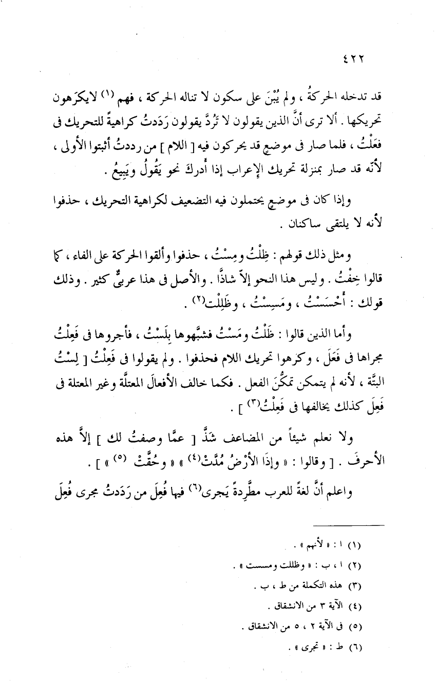 ومثل ذلك قولهم: ظلت ومست، حذفوا وألقوا الحركة على الفاء، كما قالوا خفت. وليس هذا النحو إلا شاذاً. والأصل في هذا عربيٌّ كثير. وذلك قولك: أحسست، ومسست، وظللت.