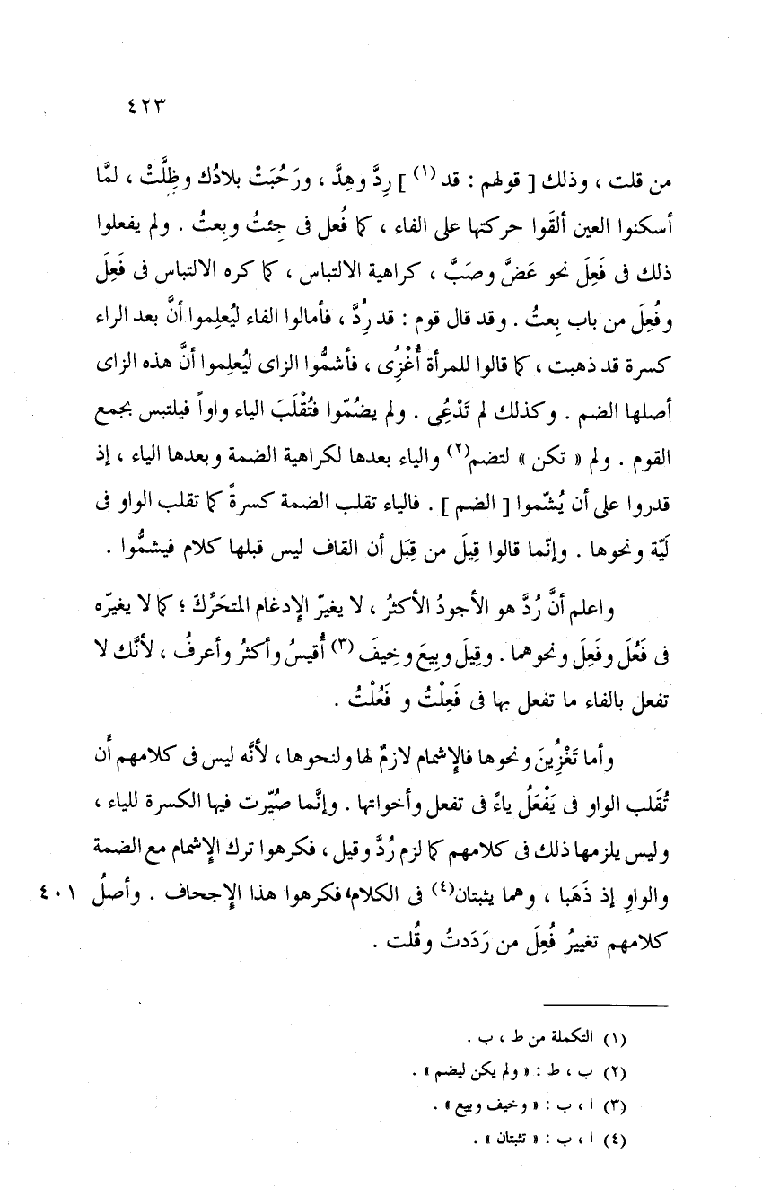 واعلم أن رد هو الأجود الأكثر، لا يغير الإدغام المتحرك؛ كما لا يغيره في فعل وفعل ونحوهما. وقيل وبيع وخيف أقيس وأكثر وأعرف، لأنك لا تفعل بالفاء ما تفعل بها في فعلت وفعلت.