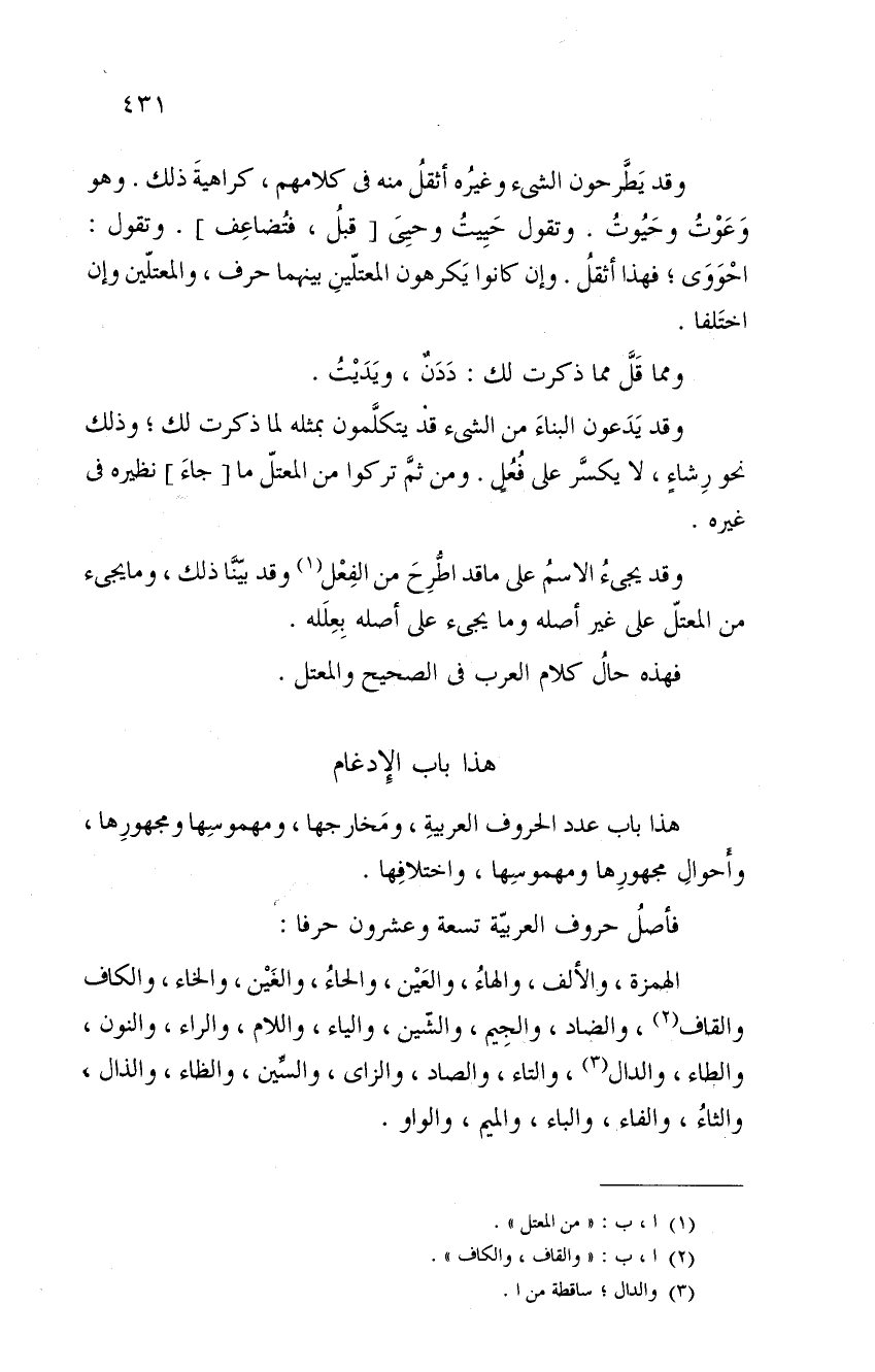 هذا باب عدد الحروف العربية، ومخارجها، ومهموسها ومجهورها، وأحوال مجهورها ومهموسها، واختلافها.