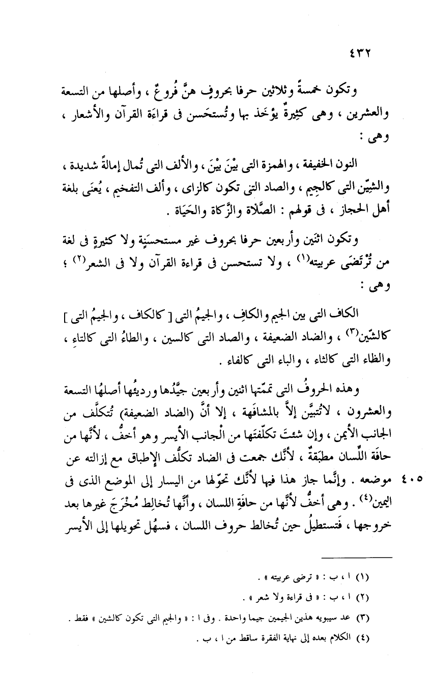 وتكون اثنين وأربعين حرفاً بحروف غير مستحسنةٍ ولا كثيرةٍ في لغة من ترتضي عربيته، ولا تستحسن في قراءة القرآن ولا في الشعر؛ وهي: الكاف التي بين الجيم والكاف، والجيم التي كالكاف، والجيم التي كالشين، والضاد الضعيفة، والصاد التي كالسين، والطاء التي كالتاء، والظاء التي كالثاء، والباء التي كالفاء.