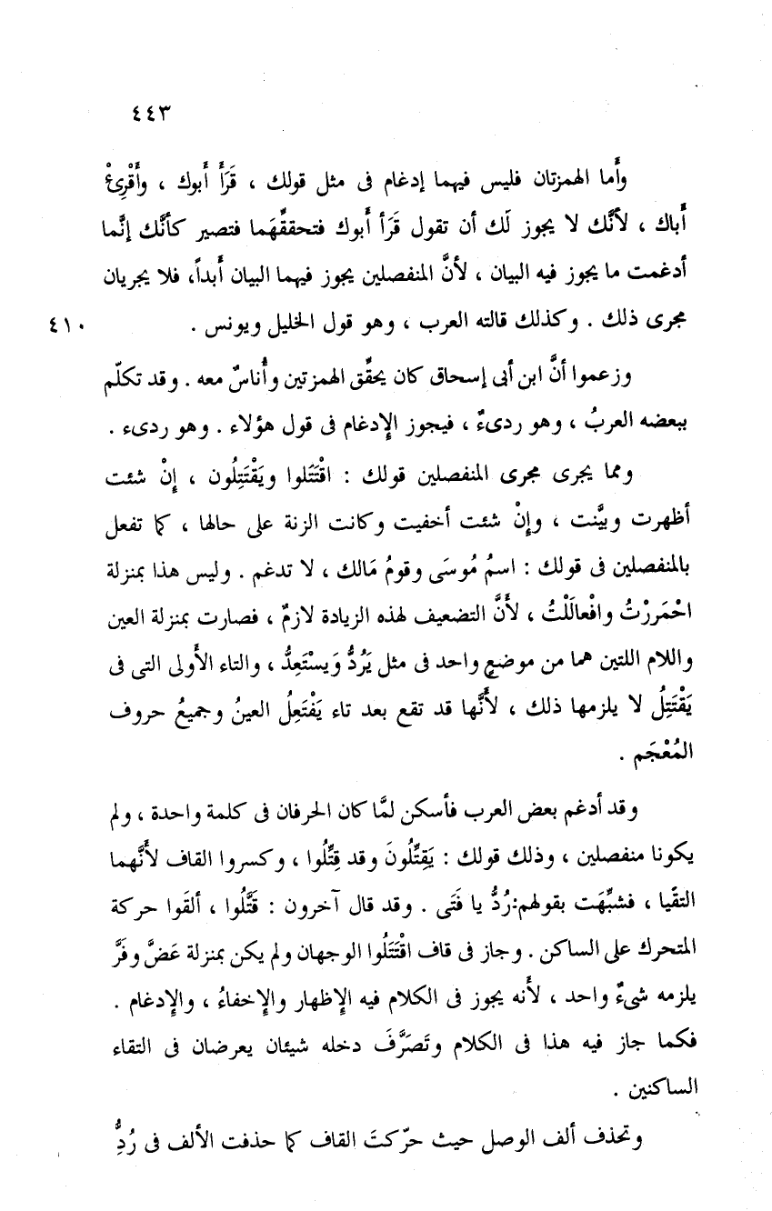 وأما الهمزتان فليس فيهما إدغام في مثل قولك، قرأ أبوك، وأقرىء أباك، لأنك لا يجوز لك أن تقول قرأ أبوك فتحققهما فتصير كأنك إنما أدغمت ما يجوز فيه البيان، لأن المنفصلين يجوز فيهما البيان أبداً، فلا يجريان مجرى ذلك. وكذلك قالته العرب وهو قول الخليل ويونس.