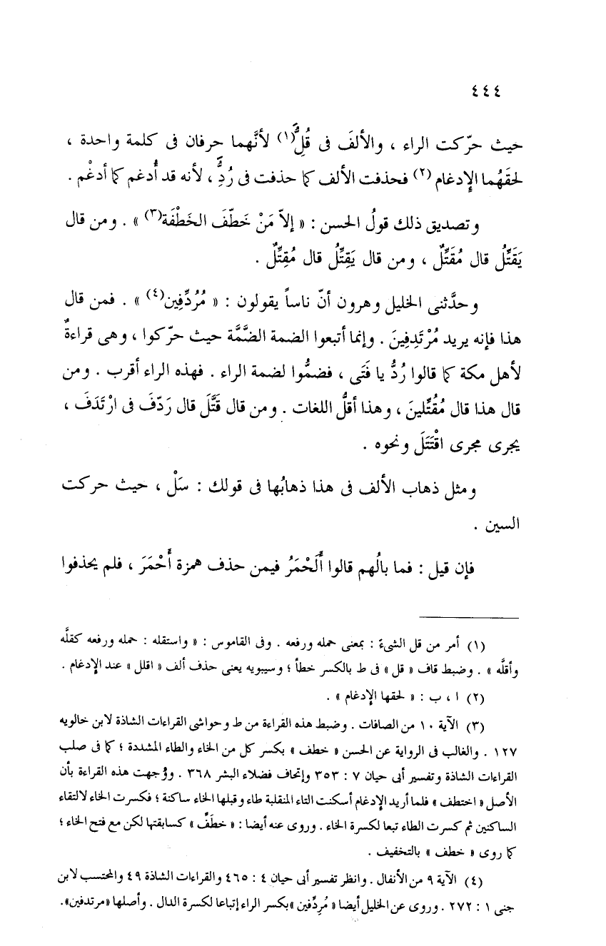 حيث حركت الراء، والألف في قل لأنهما حرفان في كلمة واحدة، لحقهما الإدغام فحذفت الألف كما حذفت في رد، لأنه قد أدغم كما أدغم.