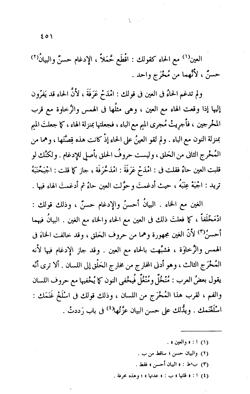 ولم تدغم الحاء في العين في قولك: امدح عرفة، لأن الحاء قد يفرون إليها إذا وقعت الهاء مع العين، وهي مثلها في الهمس والرخاوة مع قرب المخرجين، فأجريت مجرى الميم مع الباء، فجعلتها بمنزلة الهاء، كما جعلت الميم بمنزلة النون مع الباء. ولم تقو العين على الحاء إذ كانت هذه قصتها، وهما من المخرج الثاني من الحلق، وليست حروف الحلق بأصلٍ للإدغام. ولكنك لو قلبت العين حاءً فقلت في: امدح عرفة: امدحرفة، جاز كما قلت: اجبحنبه تريد: اجبه عنبه، حيث أدغمت وحولت العين حاءً ثم أدغمت الهاء فيها.