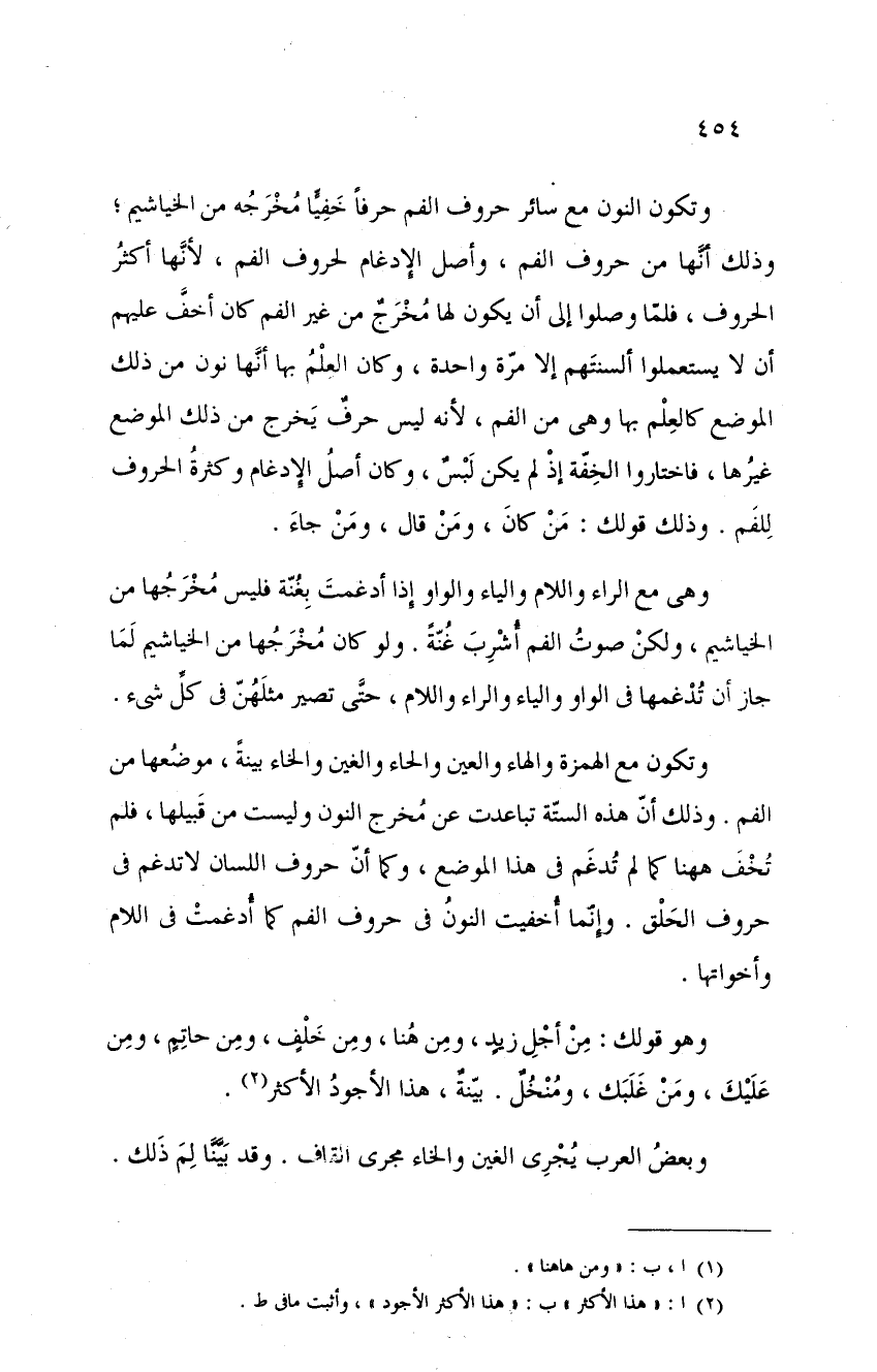 وتكون النون مع سائر حروف الفم حرفاً خفياً مخرجه من الخياشيم؛ وذلك أنها من حروف الفم، وأصل الإدغام لحروف الفم، لأنها أكثر الحروف، فلما وصلوا إلى أن يكون لها مخرجٌ من غير الفم كان أخف عليهم أن لا يستعملوا ألسنتهم إلا مرة واحدة، وكان العلم بها أنها نون من ذلك الموضع كالعلم بها وهي من الفم، لأنه ليس حرفٌ يخرج من ذلك الموضع غيرها، فاختاروا الخفة إذ لم يكن لبسٌ، وكان أصل الإدغام وكثرة الحروف للفم. وذلك قولك: من كان، ومن قال، ومن جاء.