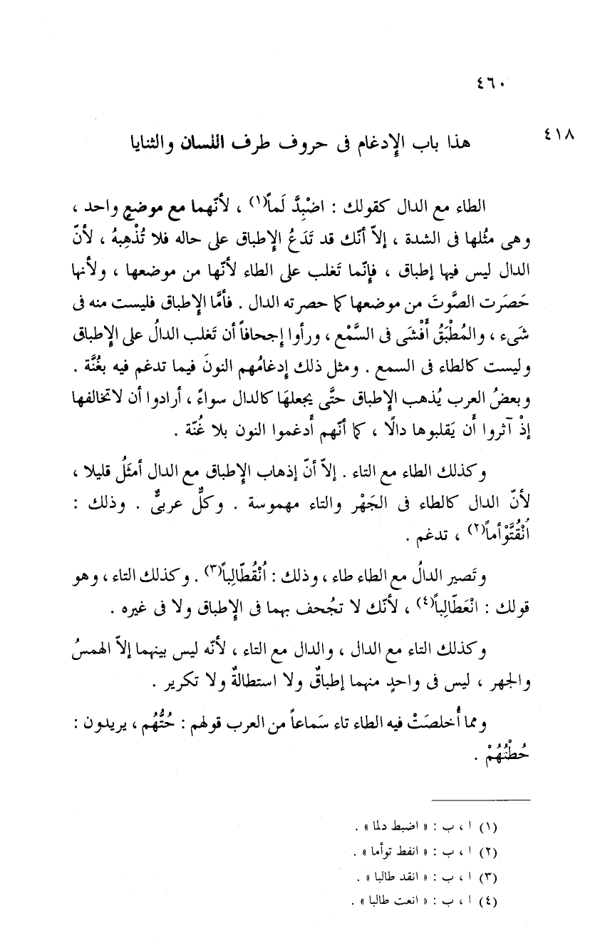 والثنايا الطاء مع الدال كقولك: اضبد لما، لأنهما مع موضعٍ واحدٍ، وهي مثلها في الشدة إلا أنك قد تدع الإطباق على حاله فلا تذهبه، لأن الدال ليس فيها إطباق، فإنم تغلب على الطاء لأنها من موضعها، ولأنها حصرت الصوت من موضعها كما حصرته الدال. فأما الإطباق فليست منه في شيء، والمطبق أفشى في السمع، ورأوا إجحافاً أن تغلب الدال على الإطباق وليست كالطاء في السمع. ومثل ذلك إدغامهم النون فيما تدغم فيه بغنة. وبعض العرب يذهب الإطباق حتى يجعلها كالدال سواءً، أرادوا أن لا تخالفها إذ آثروا أن يقلبوها دالاً، كما أنهم أدغموا النون بلا غنة.