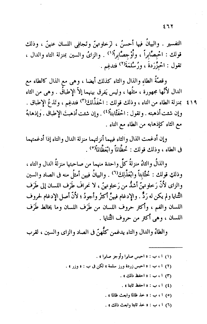 والذال والثاء كل واحدة منهما من صاحبتها منزلة الدال والتاء، وذلك قولك: خثابتاً وابعذلك. والبيان فيهن أمثل منه منه في الصاد والسين والزاي لأن رخاوتهن أشد من رخاوتهن، لانحراف طرف اللسان إلى طرف الثنايا ولم يكن له ردٌّ. والإدغام فيهن أكثر وأجود؛ لأن أصل الإدغام لحروف اللسان والفم، وأكثر حروف اللسان من طرف اللسان وما يخالط طرف اللسان، وهي أكثر من حروف الثنايا.