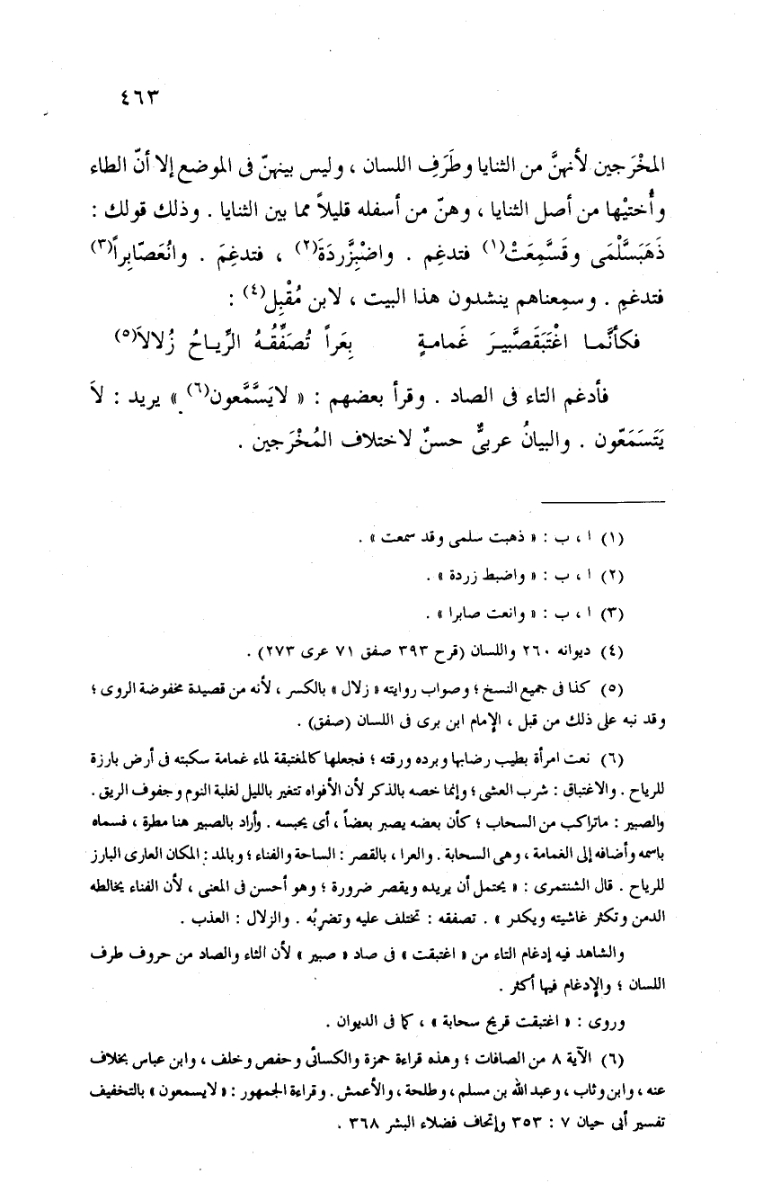 المخرجين لأنهن من الثنايا وطرف اللسان، وليس بينهن في الموضع إلا أن الطاء وأختيها من أصل الثنايا، وهن من أسفله قليلاً مما بين الثنايا. وذلك قولك: ذهبسلمى وقسمعت فتدغم. واضبزردة، فتدغمن. وانعصابراً فتدغم. وسمعناهم ينشدون هذا البيت، لابن مقبل: