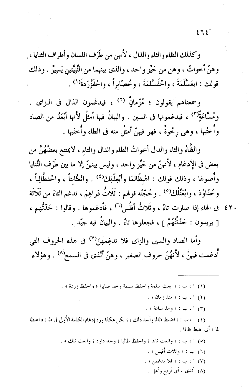 والطاء والثاء والذال أخوات الطاء والدال والتاء، لا يمتنع بعضهن من بعض في الإدغام، لأنهن من حيز واحد، وليس بينهن إلا ما بين طرف الثنايا وأصولها، وذلك قولك: اهبظالماً وأبعذلك. وانعثابتاً، واحفطالباً، وخداد، وابعتلك. وحجته قولهم: ثلاث دراهم، تدغم الثاء من ثلاثة في الهاء إذا صارت تاءً، وثلاث أفلس، فأدغموها. وقالوا: حدتهم، يريدون حدثتهم، فجعلوها تاءً. والبيان فيه جيد.
