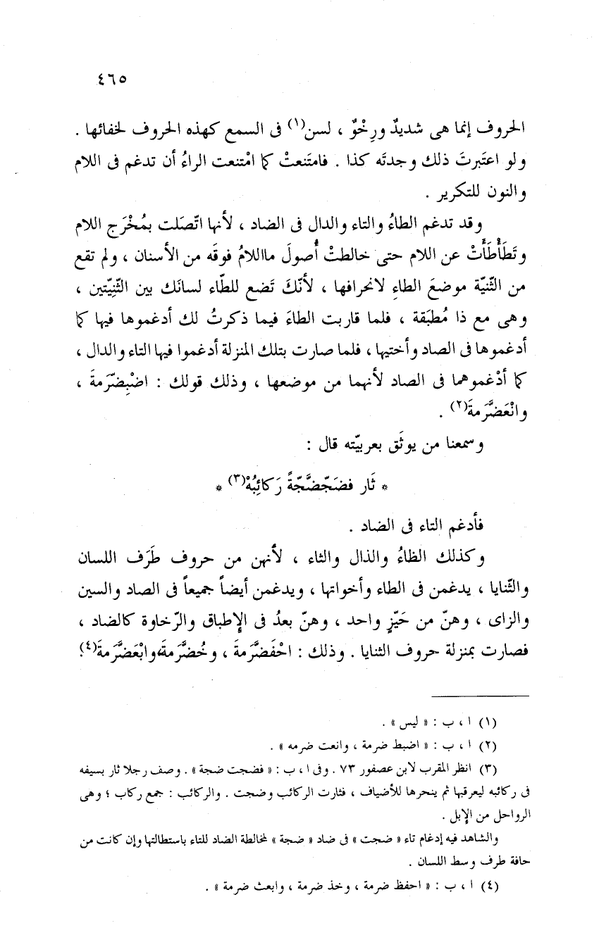 وقد تدغم الطاء والتاء والدال في الضاد، لأنها اتصلت بمخرج اللام وتطأطأت عن اللام حتى خالطت أصول ما اللام فوقه من الأسنان، ولم تقع من الثنية موضع الطاء لانحرافها، لأنك تضع للطاء لسانك بين الثنيتين، وهي مع ذا مطبقة، فلما قاربت الطاء فيما ذكرت لك أدغموها فيها كما أدغموها في الصاد وأختيها، فلما صارت بتلك المنزلة أدغموا فيها التاء والدال، كما أدغموها في الصاد لأنهما من موضعها، وذلك قولك: اضبضرمة، وانعضرمة.