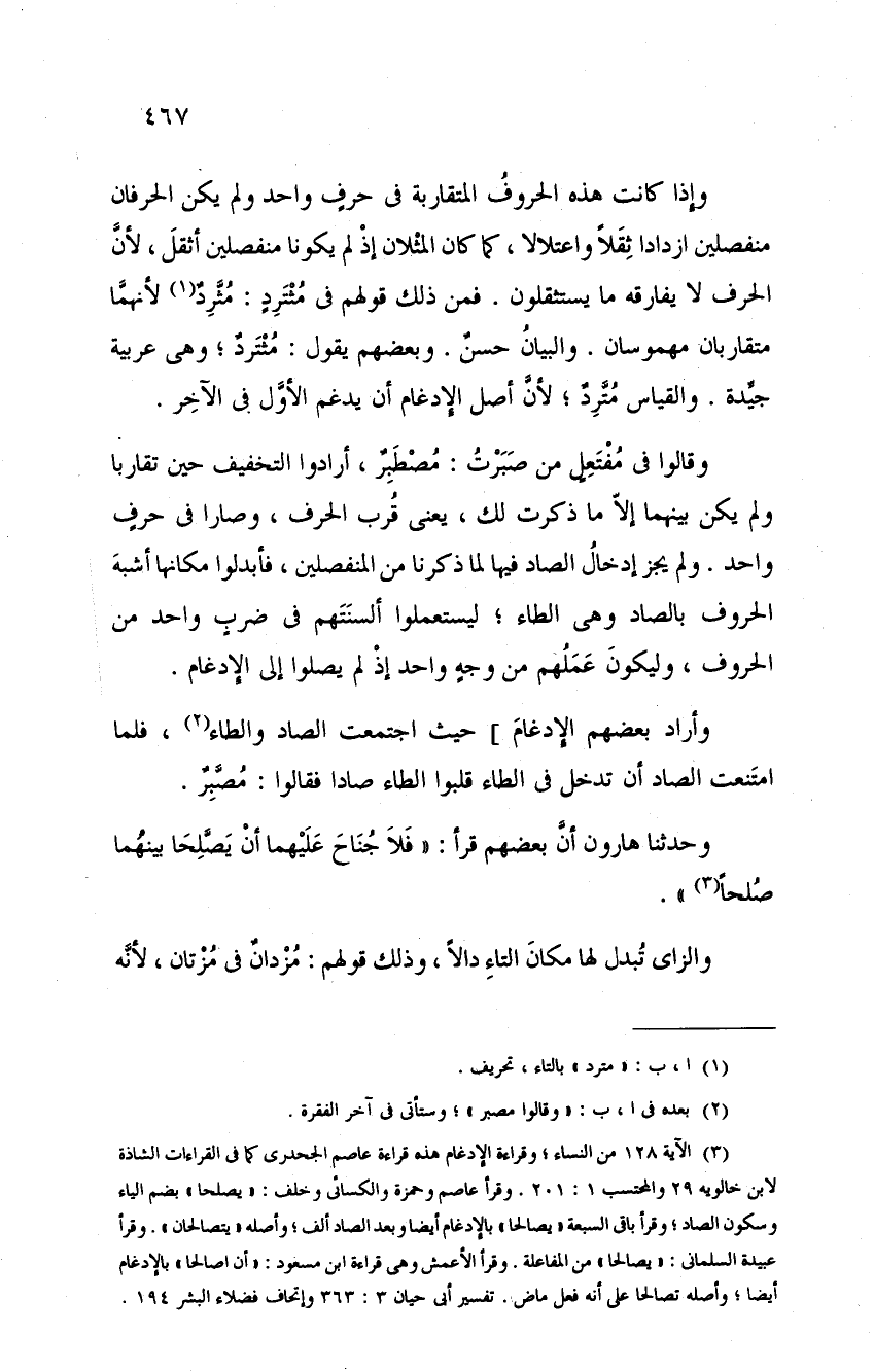 وقالوا في مفتعلٍ من صبرت: مصطبرٌ، أرادوا التخفيف حين تقاربا ولم يكن بينهما إلا ما ذكرت لك، يعني قرب الحرف، وصارا في حرفٍ واحد. ولم يجز إدخال الصاد فيها لما ذكرنا من المنفصلين، فأبدلوا مكانها أشبه الحروف بالصاد وهي الطاء؛ ليستعملوا ألسنتهم في ضربٍ واحد من الحروف، وليكون عملهم من وجهٍ واحد إذ لم يصلوا إلى الإدغام.