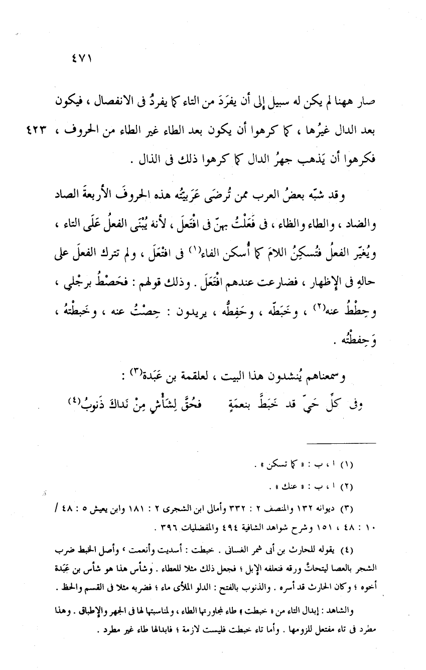 وقد شبه بعض العرب ممن ترضى عربيته هذه الحروف الأربعة الصاد والضاد، والطاء والظاء، في فعلت، بهن في افتعل، لأنه يبنى الفعل على التاء، وبغير الفعل فتسكن اللام كما أسكن الفاء في افتعل، ولم تترك الفعل على حاله في الإظهار فضارعت عندهم افتعل. وذلك قولهم: فحصط برجلي، وحصط عنه وخبطه، وحفطه، يريدون: حصت عنه، وخبطته، وحفظته.
