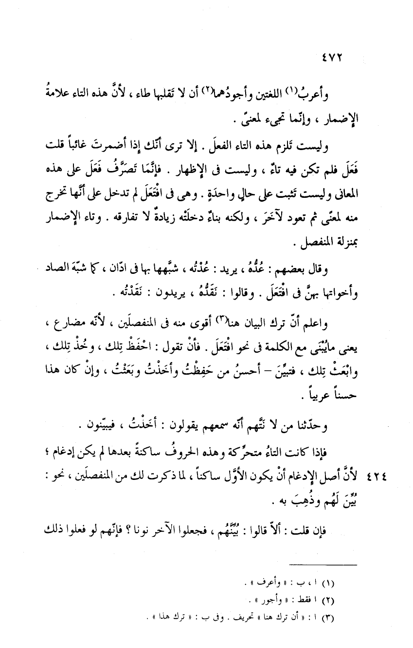 واعلم أن ترك البيان هنا أقوى منه في المنفصلين، لأنه مضارع، يعني ما يبنى مع الكلمة في نحو افتعل. فأن تقول: احفظ تلك، وخذ تلك، وابعث تلك، فتبين - أحسن من حفظت وأخذت وبعثت، وإن كان هذا حسناً عربياً.