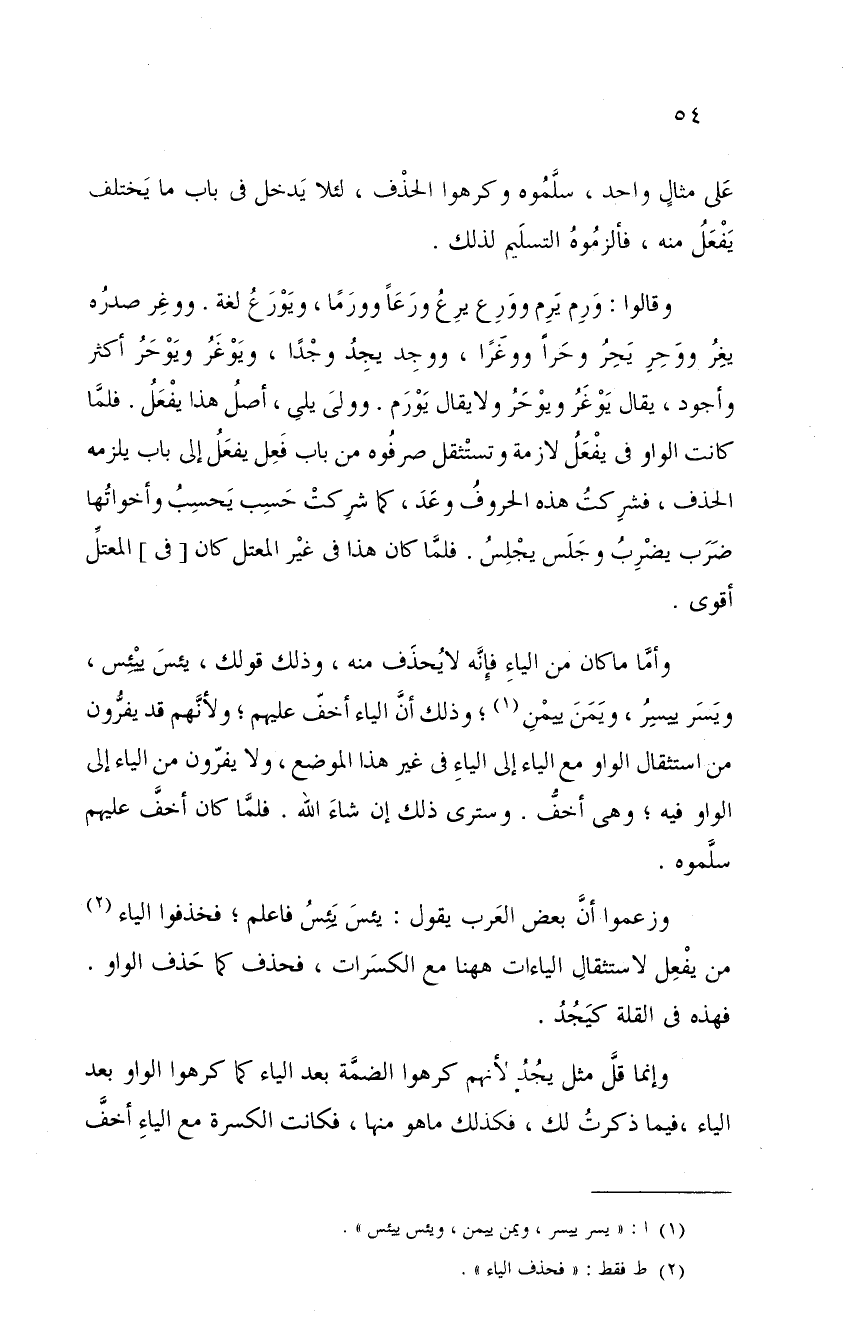 وأما ما كان من الياء فإنه لا يحذف منه، وذلك قولك، يئس ييئس، ويسر ييسر، ويمن ييمن؛ وذلك أن الياء أخف عليهم؛ ولأنهم قد يفرون من استثقال الواو ومع الياء إلى الياء في غير هذا الموضع، ولا يفرون من الياء إلى الواو فيه؛ وهي أخف. وسترى ذلك إن شاء الله. فلما كان أخف عليهم سلموه.