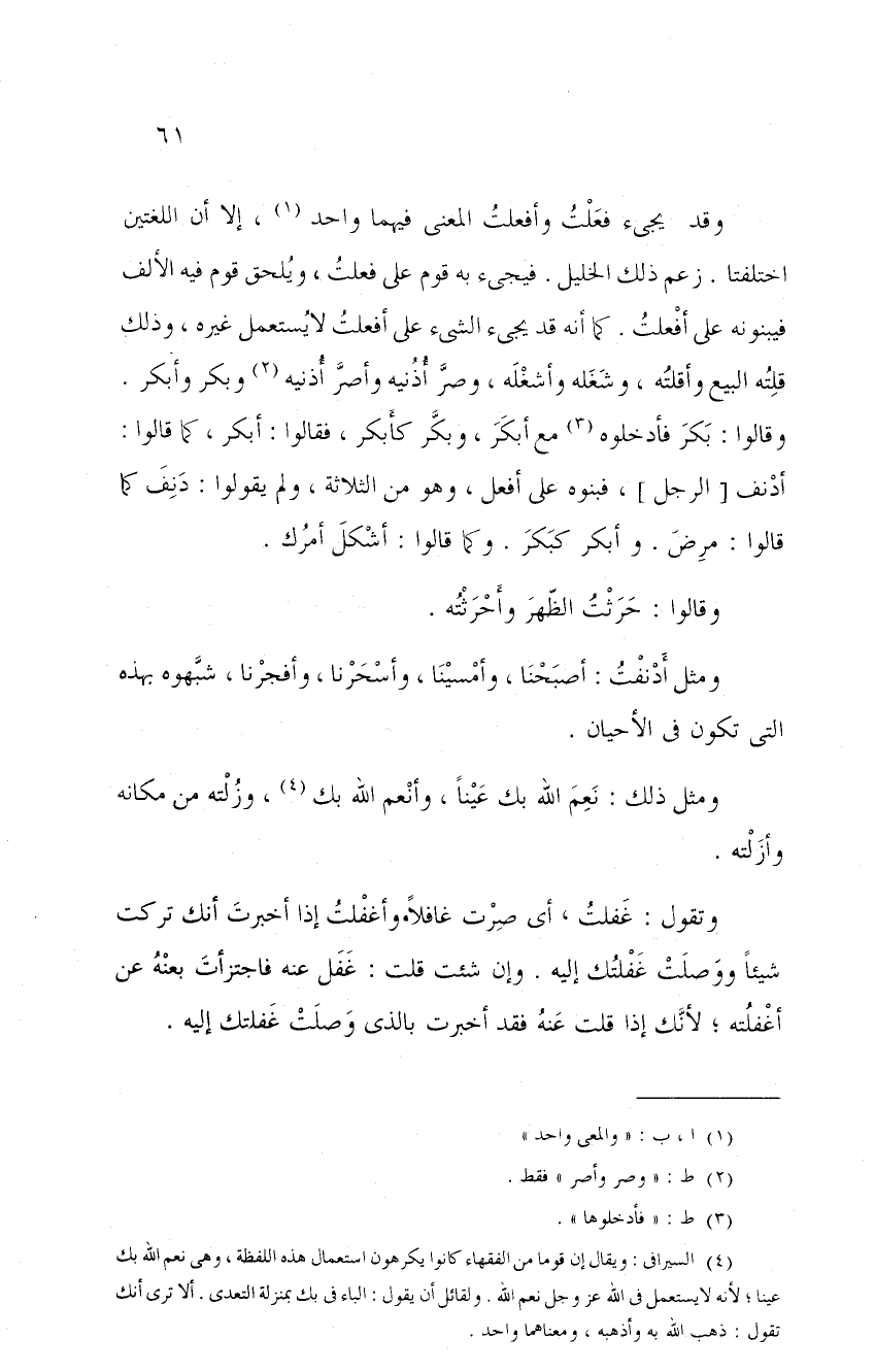 وقد يجيء فعلت وأفعلت المعنى فيهما واحد، إلا أن اللغتين اختلفتا. زعم ذلك الخليل. فيجيء به قوم على فعلت، ويلحق قوم فيه الألف فيبنونه على أفعلت. كما أنه قد يجيء الشيء على أفعلت لا يستعمل غيره، وذلك قلته البيع وأقلته، وشغله وأشغله، وصر أذنيه وأصر أذنيه وبكر وأبكر، وقالوا: بكر فأدخلوه مع أبكر وبكر كأبكر فقالوا أبكر كما قالوا: أدنف الرجل فبنوه على أفعل، وهو من الثلاثة، ولم يقولوا: دنف كما قالوا: مرض. وأبكر كبكر. وكما قالوا: أشكل أمرك.