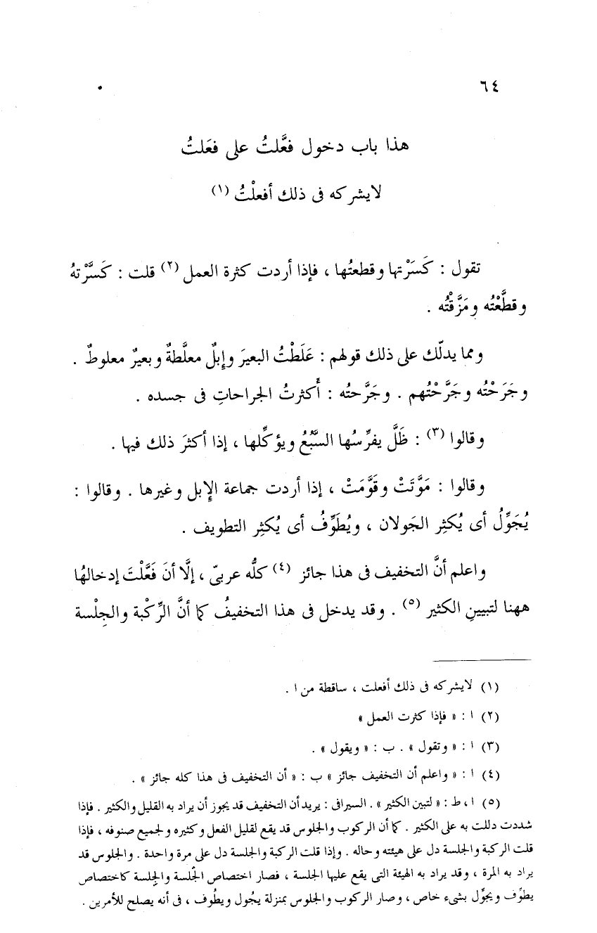 ومما يدلك على ذلك قولهم: علطت البعير وإبلٌ معلطةٌ وبعيرٌ معلوطٌ. وجرحته وجرحتهم. وجرحته: أكثرت الجراحات في جسده.