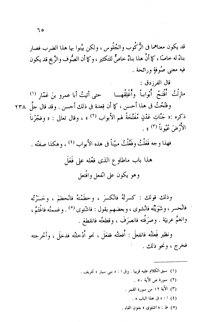 وذلك قولك: كسرته فانكسر، وحطمته فانحطم، وحسرته فانحسرن، وشويته فانشوى، وبعضهم يقول: فاشتوى. وغممته فاغتم، وانغم عربية. وصرفته فانصرف، وقطعته فانقطع.