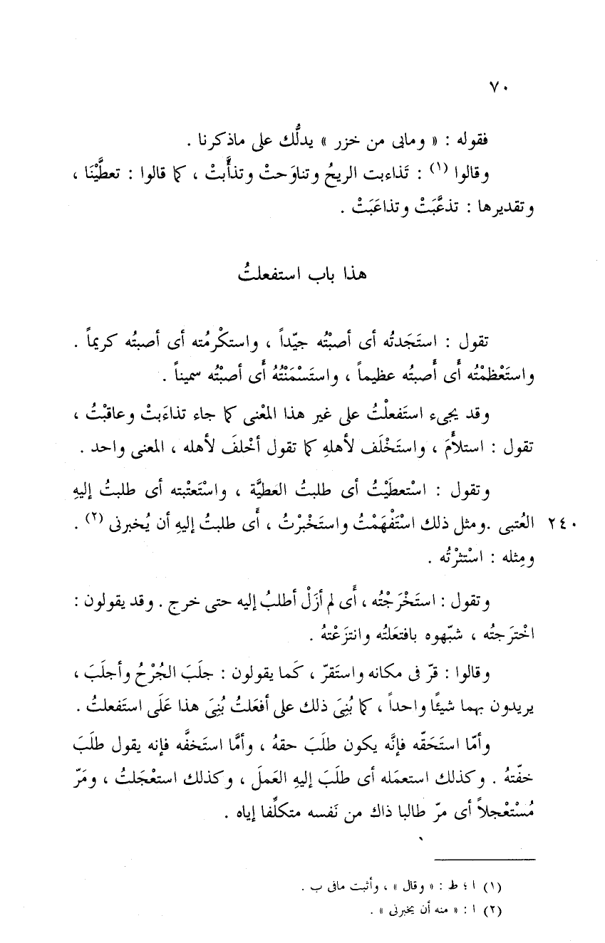 وأما استحقه فإنه يكون طلب حقه، وأما استخفه فإنه يقول طلب خفته. وكذلك استعمله أي طلب إليه العمل، وكذلك استعجلت، ومر مستعجلاً أي مر طالبا ذاك من نفسه متكلفاً إياه.