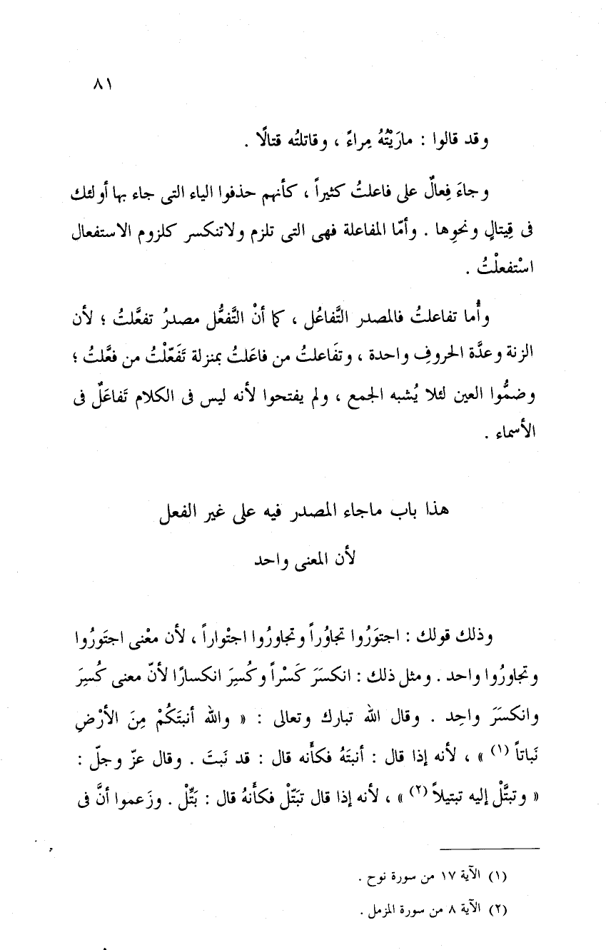 وذلك قولك: اجتوروا تجاوراً تجاوروا اجتواراً، لأن معنى اجتوروا وتجاوروا واحد. ومثل ذلك: انكسر كسراً وكسر انكساراً لأن معنى كسر وانكسر واحد. وقال الله تبارك وتعالى: " والله أنبتكم من الأرض نباتا "، لأنه إذا قال: أنبته فكأنه قال: قد نبت، وقال عز وجل: " وتبتل إليه تبتيلا "، لأنه إذا قال تبتل فكأنه قال: بتل. وزعموا أن في