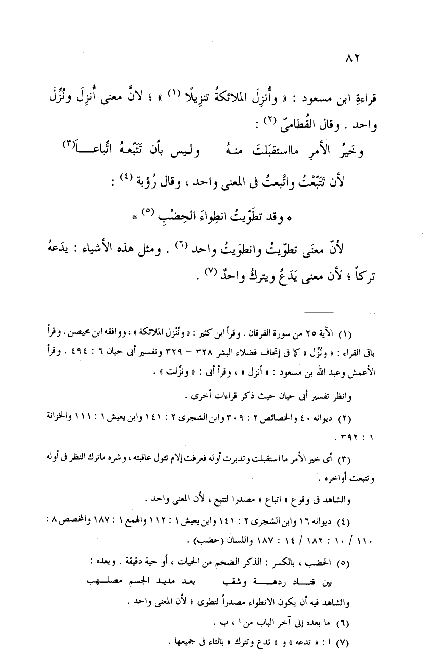 قراءة ابن مسعود: " وأنزل الملائكة تنزيلا "، لأن معنى أنزل ونزل واحد. وقال القطامي: