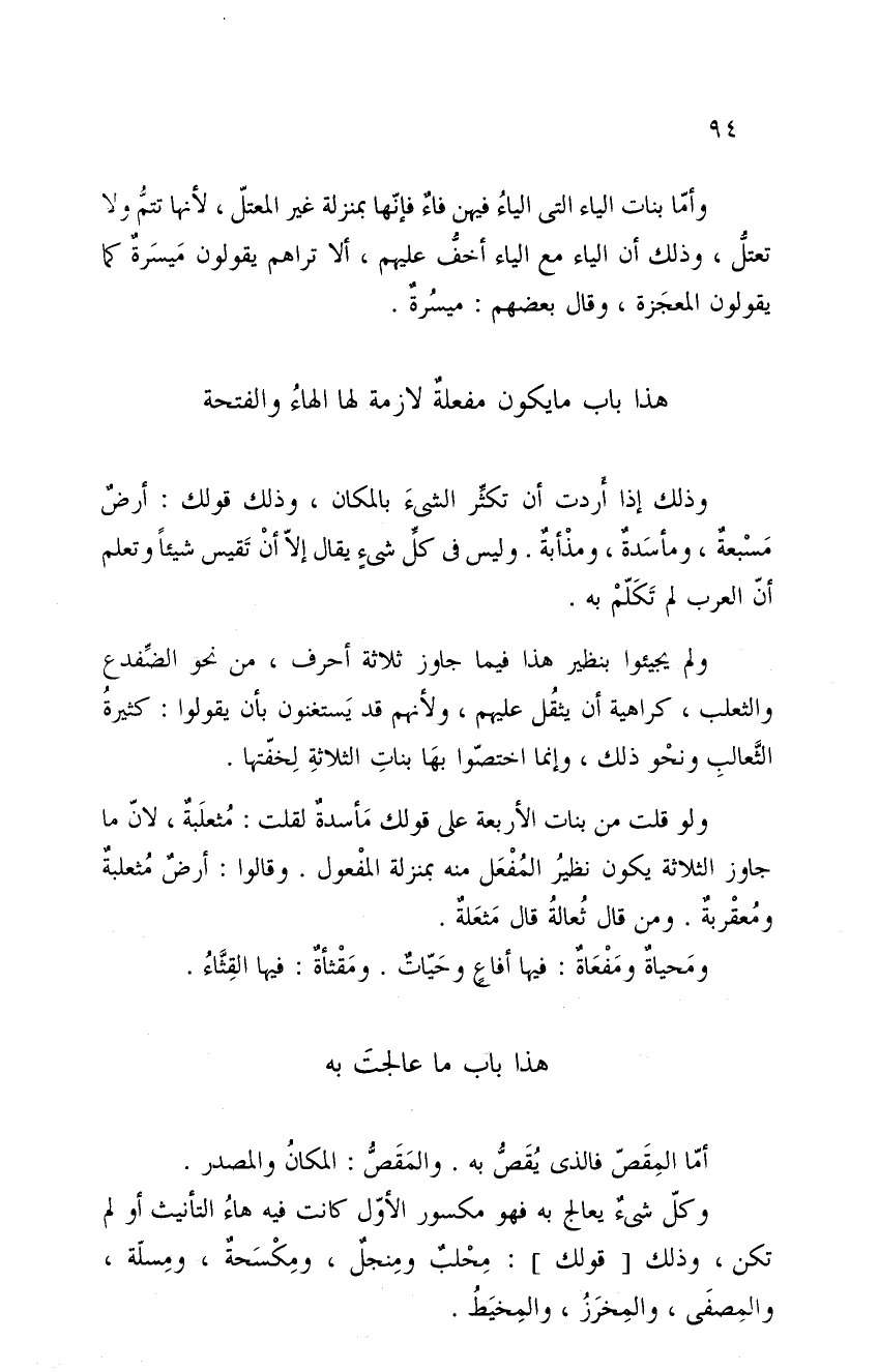 وذلك إذا أردت أن تكثر الشيء بالمكان، وذلك قولك: أرضٌ مسبعةٌ، ومأسدةٌ، ومذأبةٌ. وليس في كل شيءٍ يقال إلا أن تقيس شيئاً وتعلم أن العرب لم تكلم به.