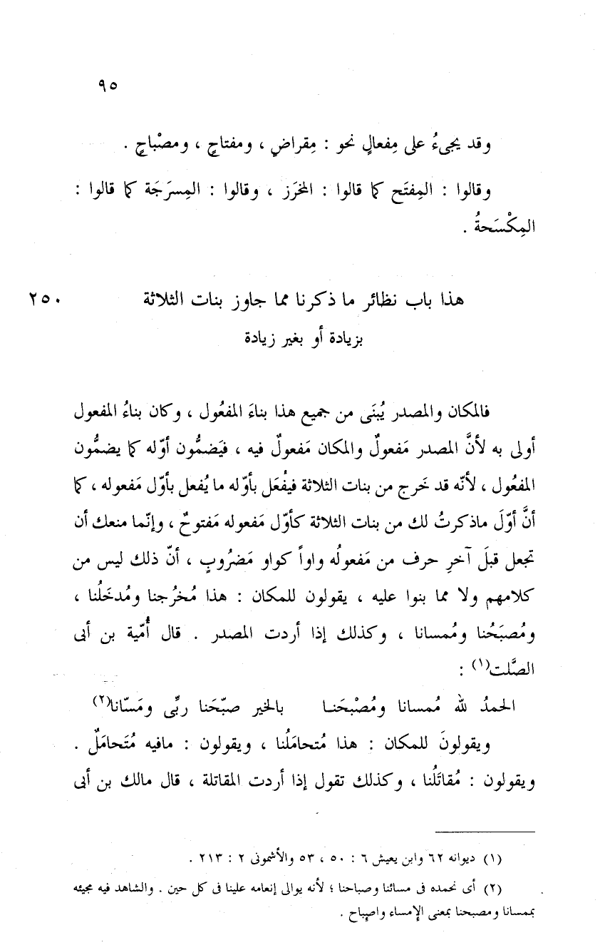 فالمكان والمصدر يبنى من جميع هذا بناء المفعول، وكان بناء المفعول أولى به لأن المصدر مفعولٌ والمكان مفعولٌ فيه، فيضمون أوله كما يضمون المفعول، لأنه قد خرج من بنات الثلاثة فيفعل بأوله ما يفعل بأول مفعوله، كما أن أول ما ذكرت لك من بنات الثلاثة كأول مفعوله مفتوحٌ، وإنما منعك أن تجعل قبل آخر حرف من مفعوله واواً كواو مضروبٍ، أن ذلك ليس من كلامهم ولا مما بنوا عليه، يقولون للمكان: هذا مخرجنا ومدخلنا، ومصبحنا وممسانا، وكذلك إذا أردت المصدر. قال أمية بن أبي الصلت:
