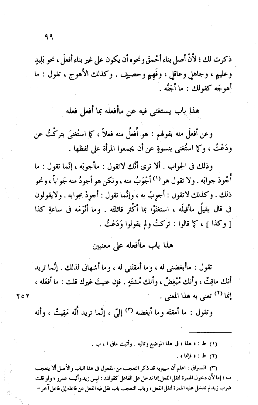 بما أفعل فعله وعن أفعل منه بقولهم: هو أفعل منه فعلاً، كما استغنى بتركت عن ودعت وكما استغنى بنسوةٍ عن أن يجمعوا المرأة على لفظها وذلك في الجواب. ألا ترى أنك لا تقول: ما أجوبه، إنما تقول: ما أجود جوابه. ولا تقول هو أجوب منه، ولكن هو أجود منه جواباً، ونحو ذلك. وكذلك لا تقول: أجوب به، وإنما تقول: أجود بجوابه. ولا يقولون في قال يقيل ما أقيله، استغنوا بما أكثر قائلته. وما أنومه في ساعة كذا وكذا، كما قالوا تركت ولم يقولوا ودعت.