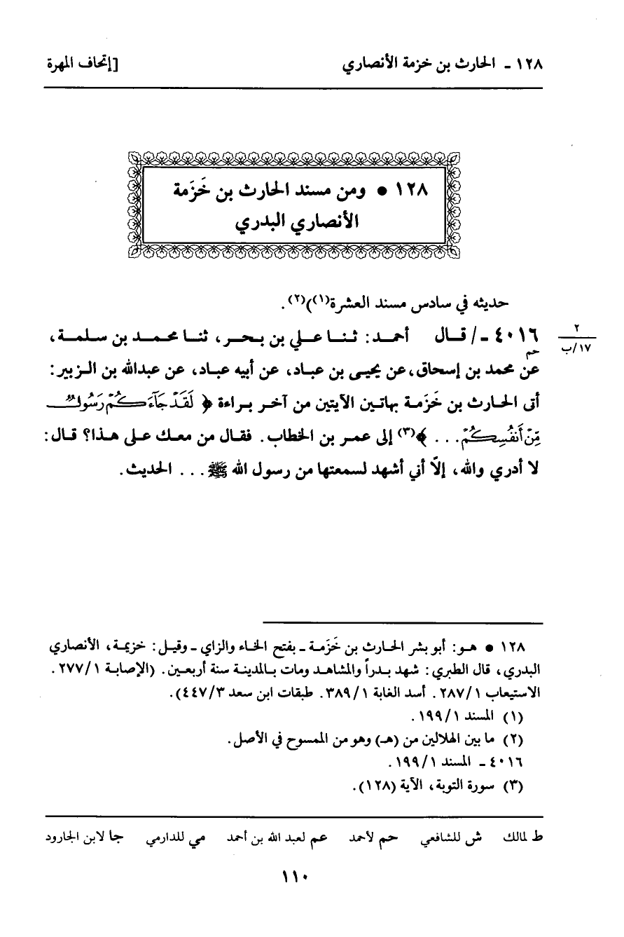 128 ـ وَمِنْ مُسْنَدِ الْحَارِثِ بْنِ خَزَمَةَ الأَنْصَارِيِّ الْبَدْرِيِّ