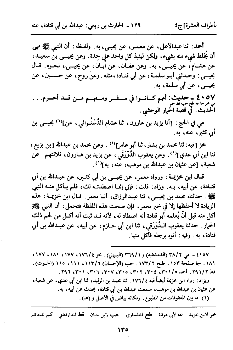 4057 - حَدِيثٌ (مي خز جا عه طح حب قط حم) : أَنَّهُمْ كَانُوا فِي سَفَرٍ وَمِنْهُمْ مَنْ قَدْ أَحْرَمَ. . . الْحَدِيثَ فِي قِصَّةِ الْحِمَارِ الْوَحْشِيِّ.