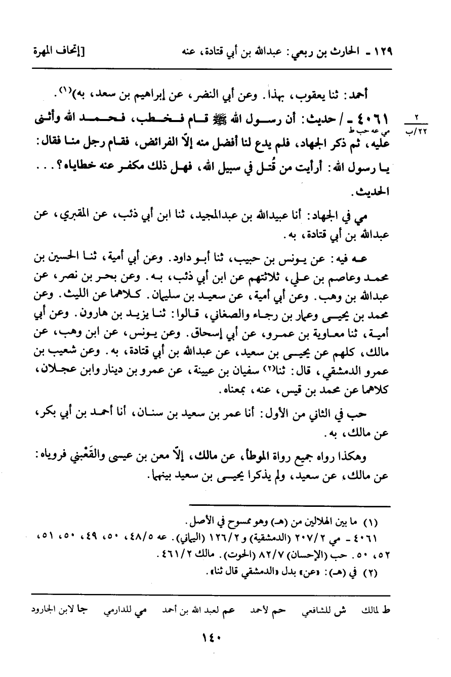 4061 - حَدِيثٌ (مي عه حب ط) : " أَنَّ رَسُولَ اللَّهِ صَلَّى اللَّهُ عَلَيْهِ وَسَلَّمَ قَامَ فَخَطَبَ، فَحَمِدَ اللَّهَ وَأَثْنَى عَلَيْهِ، ثُمَّ ذَكَرَ الْجِهَادَ، فَلَمْ يَدَعْ لَنَا أَفْضَلَ مِنْهُ إِلا الْفَرَائِضَ، فَقَامَ رَجُلٌ مِنَّا فَقَالَ: يَا رَسُولَ اللَّهِ: أَرَأَيْتَ مِنْ قُتِلَ فِي سَبِيلِ اللَّهِ، فَهَلْ ذَلِكَ مُكَفِّرٌ عَنْهُ خَطَايَاهُ؟ . . . " الْحَدِيثَ.