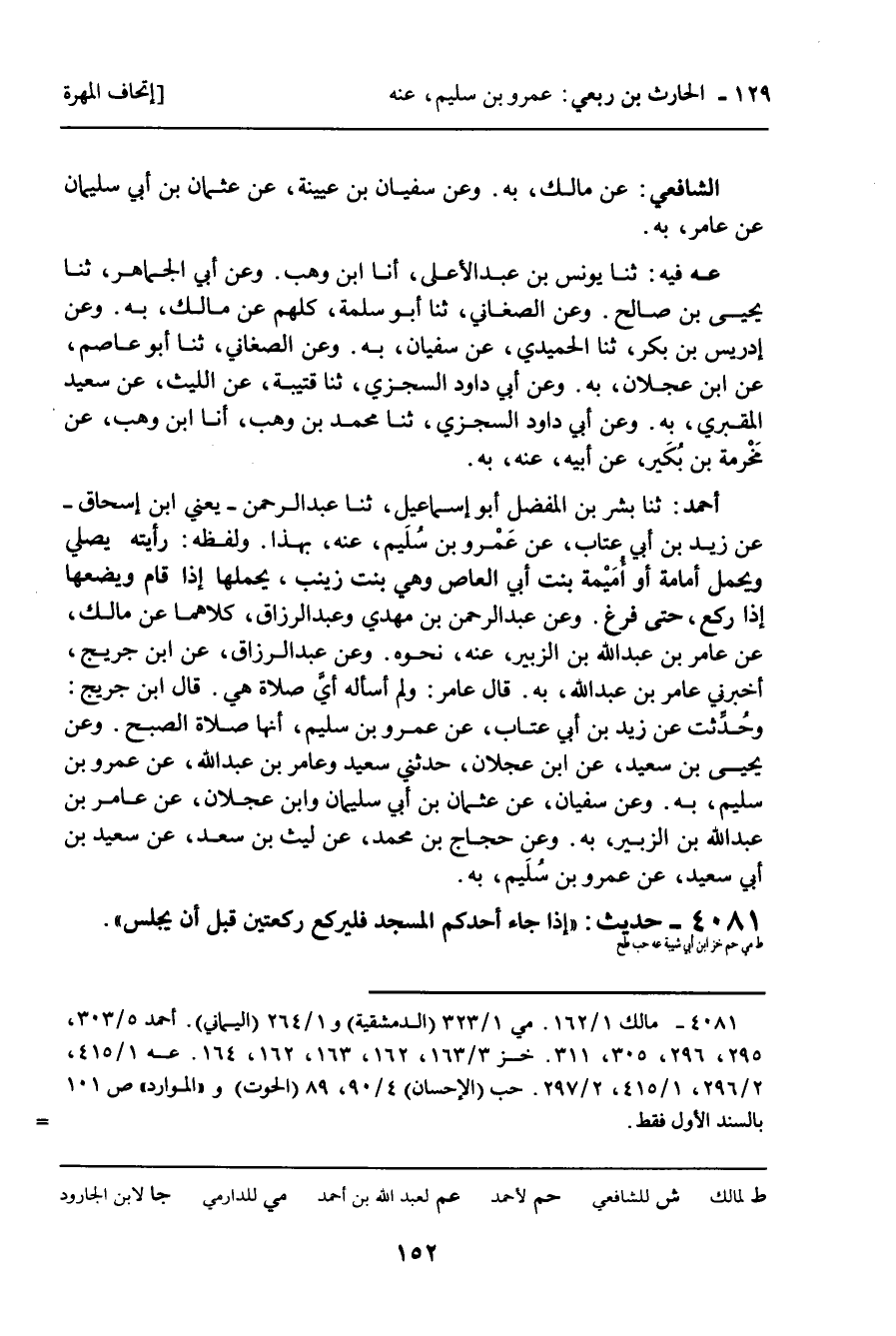 حب فِي السَّابِعِ وَالسِّتِّينَ مِنَ الأَوَّلِ: أنا الْحَسَنُ بْنُ سُفْيَانَ، ثنا هُدْبَةُ بْنُ خَالِدٍ، ثنا هَمَّامٌ، عَنِ ابْنِ جُرَيْجٍ، عَنْ عَامِرِ بْنِ عَبْدِ اللَّهِ، بِهِ. وَعَنِ الْفَضْلِ بْنِ الْحُبَابِ، ثنا الْقَعْنَبِيُّ، عَنْ مَالِكٍ، بِهِ. وَفِي التَّاسِعِ وَالأَرْبَعِينَ مِنَ الثَّانِي: ثنا الْحَسَنُ بْنُ أَحْمَدَ بْنِ إِبْرَاهِيمَ بْنِ فِيلٍ أَبُو الطَّاهِرِ إِمَامُ جَامِعِ أَنْطَاكِيَةَ، ثنا مُحَمَّدُ بْنُ عَمْرِو بْنِ الْعَبَّاسِ، ثنا مُعْتَمِرُ بْنُ سُلَيْمَانَ، بِهِ. وَفِي الصَّلاةِ: أنا عَمْرُو بْنُ سَعِيدِ بْنِ سِنَانٍ، أنا أَحْمَدُ بْنُ أَبِي بَكْرٍ، عَنْ مَالِكٍ، بِهِ. وَعَنْ خَلَفِ بْنِ حَنْظَلَةَ الضَّبْعِيِّ، حَدَّثَنَا مُحَمَّدُ بْنُ مُشْكَانَ، ثنا جَعْفَرُ بْنُ عَوْنٍ، ثنا أَبُو عُمَيْسٍ، عَنْ عَامِرِ بْنِ عَبْدِ اللَّهِ بْنِ الزُّبَيْرِ، بِمَعْنَاهُ. وَأَوَّلُهُ: “ إِذَا جَاءَ أَحَدُكُمُ الْمَسْجِدَ فَلا يَبْدَأُ بِشَيْءٍ، حَتَّى يُصَلِّيَ رَكْعَتَيْنِ. . . “ الْحَدِيثَ. وَعَنِ الْحُسَيْنِ بْنِ مُحَمَّدِ بْنِ مُصْعَبٍ، ثنا أَبُو سَعِيدٍ الأَشَجُّ، بِهِ. وَعَنِ الْحَسَنِ بْنِ سُفْيَانَ، بِهِ.