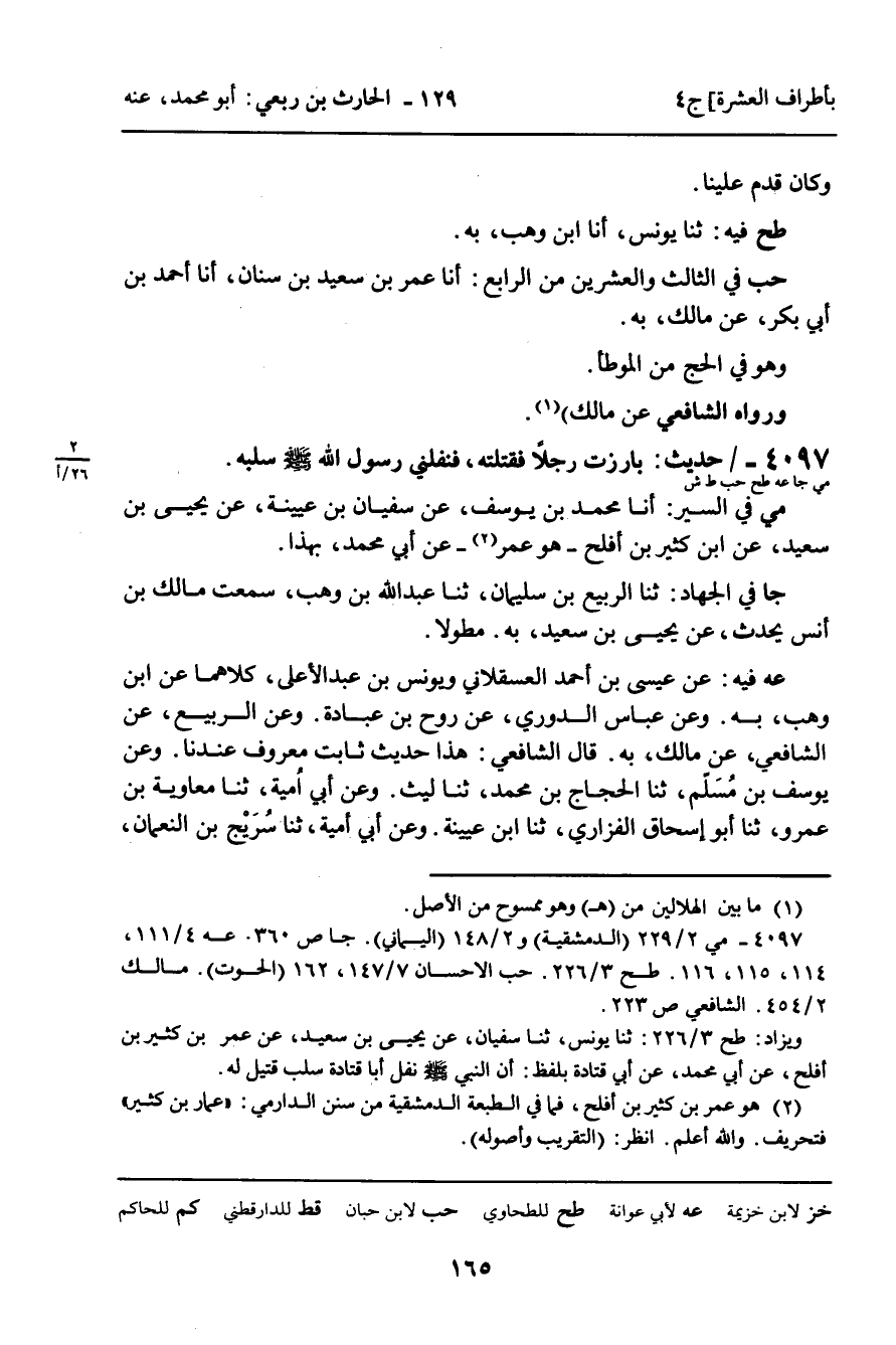 حب فِي الْحَادِي وَالْعِشْرِينَ مِنَ الأَوَّلِ: أنا عُمَرُ بْنُ سَعِيدِ بْنِ سِنَانٍ بِمَنْبِجَ، ثنا أَحْمَدُ بْنُ أَبِي بَكْرٍ الزُّهْرِيُّ، عَنْ مَالِكٍ، بِذَلِكَ. وَفِي الثَّالِثِ مِنَ الْخَامِسِ: أنا الْحُسَيْنُ بْنُ إِدْرِيسَ، أنا أَحْمَدُ بْنُ أَبِي بَكْرٍ، بِهِ. وَهَكَذَا هُوَ فِي الْجِهَادِ مِنَ الْمُوَطَّأِ. رَوَاهُ الشَّافِعِيُّ: عَنْ مَالِكٍ، بِهِ.