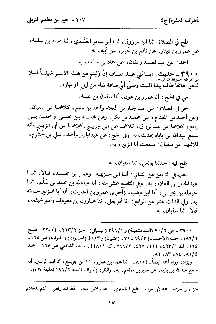 3900 - حَدِيثٌ (مي خز طح حب قط كم ش حم) : " يَا بَنِي عَبْدِ مَنَافٍ إِنْ وَلِيتُمْ مِنْ هَذَا الأَمْرِ شَيْئًا فَلا تَمْنَعُوا طَائِفًا طَافَ بِهَذَا الْبَيْتِ وَصَلَّى أَيَّ سَاعَةٍ شَاءَ مِنْ لَيْلٍ أَوْ نَهَارٍ ". مي فِي الْحَجِّ: أنا عَمْرُو بْنُ عَوْنٍ، أنا سُفْيَانُ بْنُ عُيَيْنَةَ. خز فِي الصَّلاةِ: عَنْ عَبْدِ الْجَبَّارِ بْنِ الْعَلاءِ وَأَحْمَدَ بْنِ مَنِيعٍ، كِلاهُمَا عَنْ سُفْيَانَ. وَعَنْ أَحْمَدَ بْنِ الْمِقْدَامِ، عَنْ مُحَمَّدِ بْنِ بَكْرٍ. وَعَنْ مُحَمَّدِ بْنِ يَحْيَى وَمُحَمَّدِ بْنِ رَافِعٍ، كِلاهُمَا عَنْ عَبْدِ الرَّزَّاقِ، كِلاهُمَا عَنِ ابْنِ جُرَيْجٍ، كِلاهُمَا عَنْ أَبِي الزُّبَيْرِ، أَنَّهُ سَمِعَ عَبْدَ اللَّهِ بْنَ بَابَاهْ يُحَدِّثُ، بِهِ. وَفِي الْحَجِّ: عَنْ عَبْدِ الْجَبَّارِ وَأَحْمَدَ وَعَلِيِّ بْنِ خَشْرَمٍ، ثَلاثَتُهُمْ عَنْ سُفْيَانَ: سَمِعْتُ أَبَا الزُّبَيْرِ، بِهِ. طح فِيهِ: حَدَّثَنَا يُونُسُ، ثنا سُفْيَانُ، بِهِ. حب فِي الثَّامِنِ مِنَ الثَّانِي: أنا ابْنُ خُزَيْمَةَ وَعُمَرُ بْنُ مُحَمَّدٍ، قَالا: ثنا عَبْدُ الْجَبَّارِ بْنُ الْعَلاءِ، بِهِ. وَفِي التَّاسِعَ عَشَرَ مِنْهُ: أنا عَبْدُ اللَّهِ بْنُ مُحَمَّدِ بْنِ سَلْمٍ، ثنا حَرْمَلَةُ بْنُ يَحْيَى، أنا ابْنُ وَهْبٍ، أَخْبَرَنِي عَمْرُو بْنُ الْحَارِثِ، أَنَّ أَبَا الزُّبَيْرِ حَدَّثَهُ بِهِ. وَفِي الثَّالِثَ عَشَرَ مِنَ الرَّابِعِ: أنا أَبُو يَعْلَى، ثنا هَارُونُ بْنُ مَعْرُوفٍ وَأَبُو خَيْثَمَةَ، قَالا: ثنا سُفْيَانُ، بِهِ.