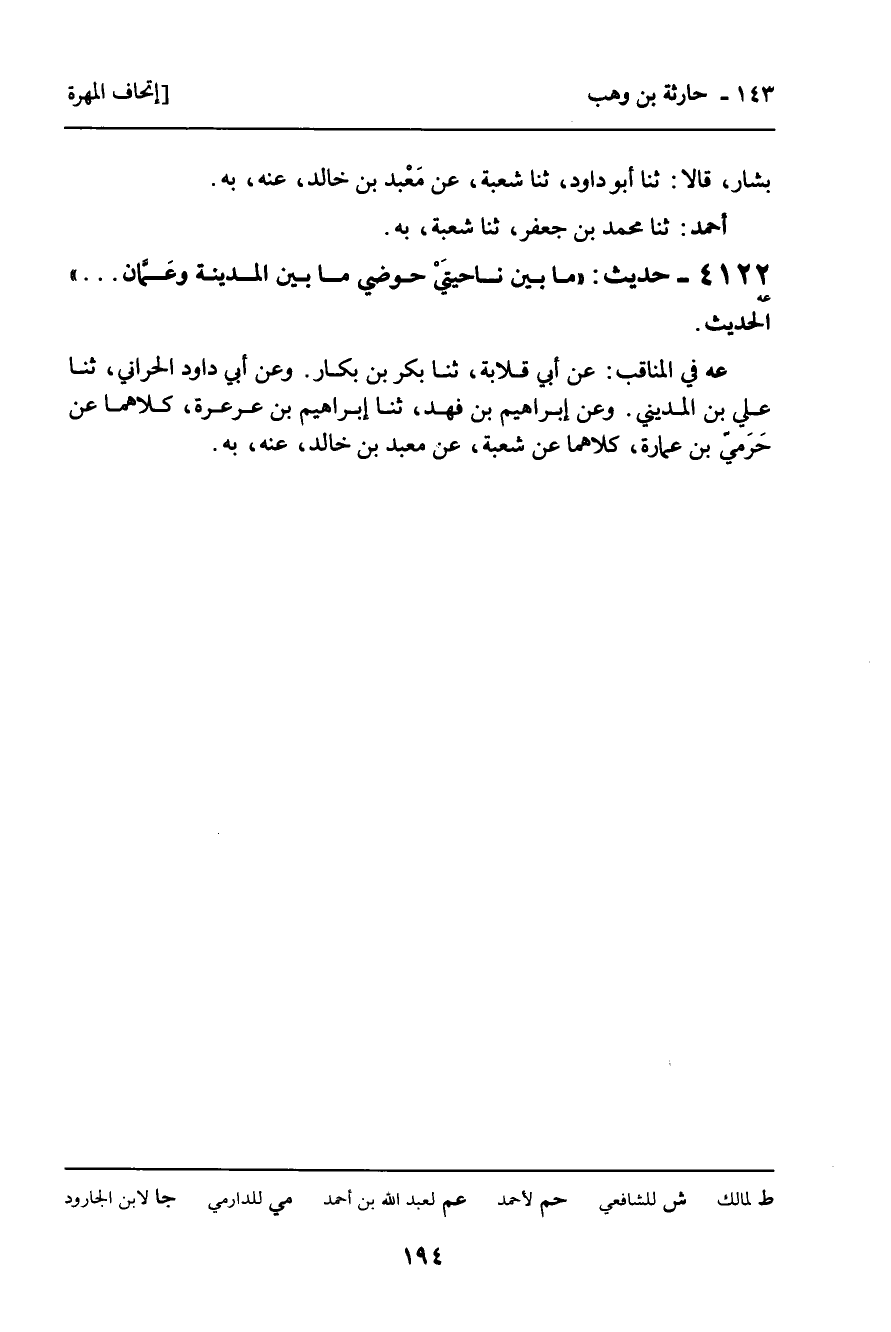 عه فِي الْمَنَاقِبِ: عَنْ أَبِي قِلابَةَ، ثنا بَكْرُ بْنُ بَكَّارٍ. وَعَنْ أَبِي دَاوُدَ الْحَرَّانِيِّ، ثنا عَلِيٌّ ابْنُ الْمَدِينِيِّ. وَعَنْ إِبْرَاهِيمَ بْنِ فَهْدٍ، ثنا إِبْرَاهِيمُ بْنُ عَرْعَرَةَ، كِلاهُمَا عَنْ حَرَمِيِّ بْنِ عُمَارَةَ، كِلاهُمَا عَنْ شُعْبَةَ، عَنْ مَعْبَدِ بْنِ خَالِدٍ، عَنْهُ، بِهِ.