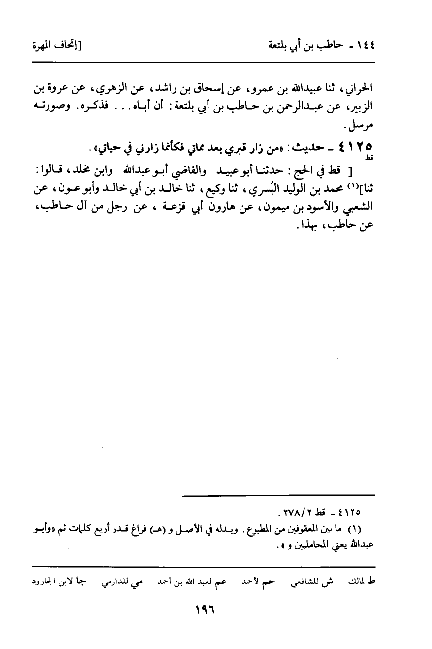 قط فِي الْحَجِّ: حَدَّثَنَا أَبُو عُبَيْدٍ، وَالْقَاضِي أَبُو عَبْدِ اللَّهِ، وَابْنُ مَخْلَدٍ، قَالُوا: ثنا مُحَمَّدُ بْنُ الْوَلِيدِ الْبُسْرِيُّ، ثنا وَكِيعٌ، ثنا خَالِدُ بْنُ أَبِي خَالِدٍ، وَأَبُو عَوْنٍ، عَنِ الشَّعْبِيِّ، وَالأَسْوَدِ بْنِ مَيْمُونٍ، عَنْ هَارُونَ أَبِي قَزْعَةَ، عَنْ رَجُلٍ مِنْ آلِ حَاطِبٍ، عَنْ حَاطِبٍ، بِهَذَا.
