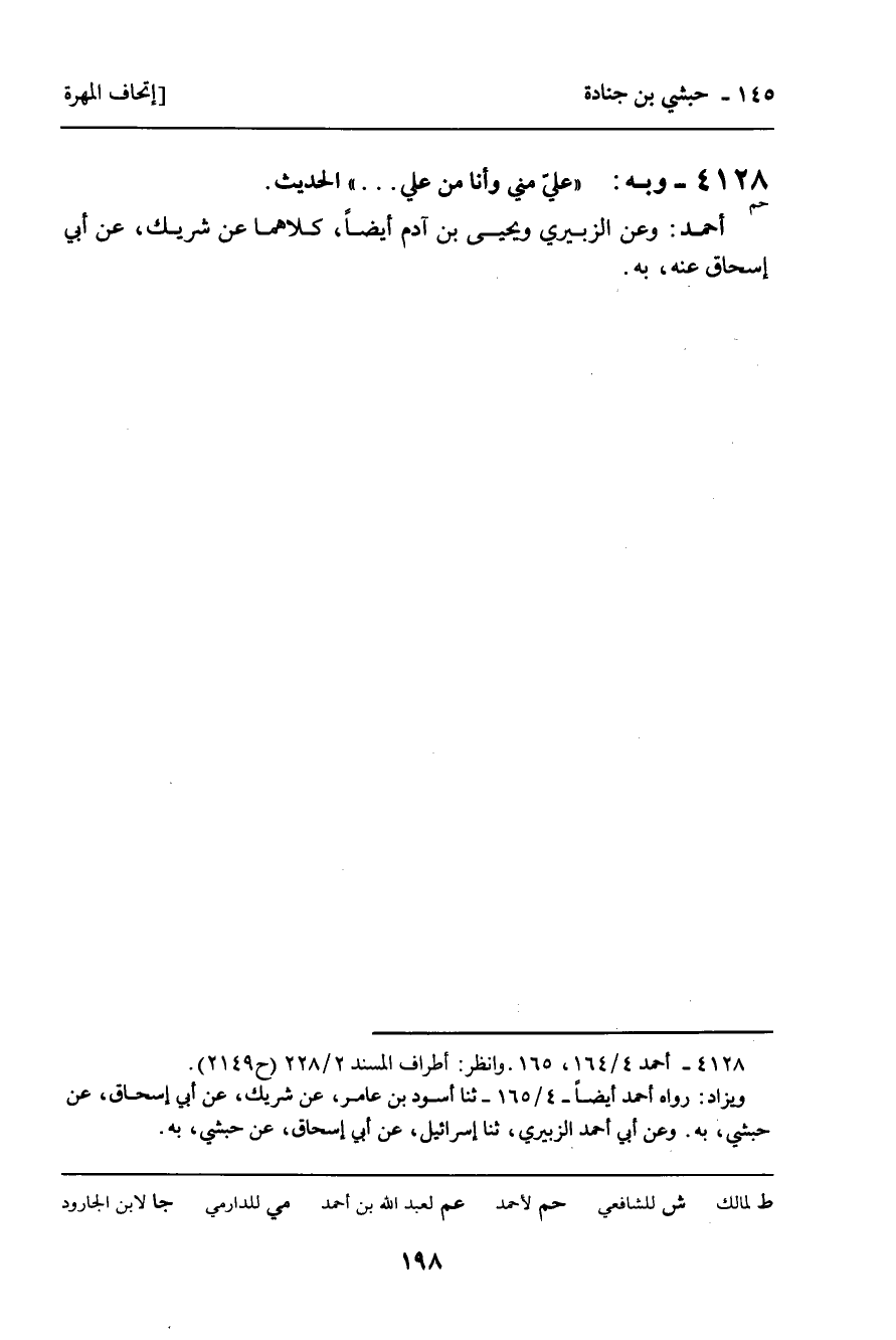 4128 - وَبِهِ (حم) : " عَلِيٌّ مِنِّي وَأَنَا مِنْ عَلِيٍّ. . . ". الْحَدِيثَ.