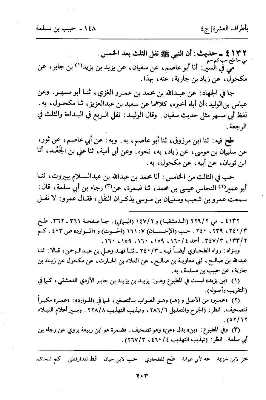 كم فِي قَسْمِ الْفَيْءِ: ثنا أَبُو بَكْرِ بْنُ بَالَوَيْهِ، ثنا الْحُسَيْنُ بْنُ شَبِيبٍ الْمَعْمَرِيُّ، ثنا عَبْدُ اللَّهِ بْنُ أَحْمَدَ بْنِ ذَكْوَانَ، وَمَحْمُودُ بْنُ خَالِدٍ الدِّمَشْقِيَّانِ، قَالا: ثنا مَرْوَانُ بْنُ مُحَمَّدٍ، ثنا يَحْيَى بْنُ حَمْزَةَ، سَمِعْتُ أَبَا وَهْبٍ يَقُولُ: سَمِعْتُ مَكْحُولا يَقُولُ: كُنْتُ عَبْدًا بِمِصْرَ لامْرَأَةٍ مِنْ هُذَيْلٍ فَأَعْتَقَتْنِي، فَمَا خَرَجْتُ مِنْ مِصْرَ وَبِهَا عِلْمٌ إِلا حَوَيْتُهُ فِيمَا أَرَى، ثُمَّ أَتَيْتُ الشَّامَ فَغَرْبَلْتُهَا، كُلُّ ذَلِكَ أَسْأَلُ عَنِ النَّفْلِ، فَلَمْ أَجِدْ أَحَدًا يُخْبِرُنِي مِنْهُ بِشَيْءٍ، حَتَّى لَقِيتُ شَيْخًا يُقَالُ لَهُ: زِيَادُ بْنُ جَابِرٍ، بِهِ. . . فَذَكَرَهُ. وَعَنْ أَبِي الْعَبَّاسِ مُحَمَّدِ بْنِ يَعْقُوبَ، ثنا أَبُو الْبَخْتَرِيِّ عَبْدُ اللَّهِ بْنُ مُحَمَّدِ بْنِ شَاكِرٍ، ثنا مُصْعَبُ بْنُ الْمِقْدَامِ، عَنْ سُفْيَانَ، بِهِ. وَقَالَ: صَحِيحُ الإِسْنَادِ. وَفِي الْمَنَاقِبِ: ثنا أَبُو الْعَبَّاسِ، ثنا الرَّبِيعُ، ثنا بِشْرُ بْنُ بَكْرٍ، ثنا عَبْدُ الرَّحْمَنِ بْنُ ثَابِتِ بْنِ ثَوْبَانَ، عَنْ أَبِيهِ، عَنْ مَكْحُولٍ، عَنْ زِيَادٍ، بِهِ.