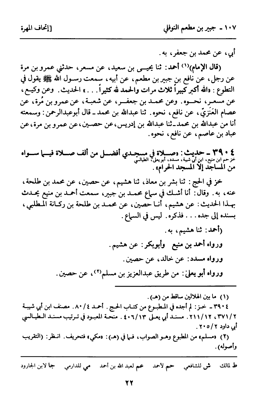 خز فِي الْحَجِّ: ثنا بِشْرُ بْنُ مُعَاذٍ، ثنا هُشَيْمٌ، عَنْ حُصَيْنٍ، عَنْ مُحَمَّدِ بْنِ طَلْحَةَ، عَنْهُ، بِهِ. وَقَالَ: أَنَا أَشُكُّ فِي سَمَاعِ مُحَمَّدِ بْنِ جُبَيْرٍ، سَمِعْتُ أَحْمَدَ بْنَ مَنِيعٍ يُحَدِّثُ بِهَذَا الْحَدِيثِ: عَنْ هُشَيْمٍ، أنا حُصَيْنٌ، عَنْ مُحَمَّدِ بْنِ طَلْحَةَ بْنِ رُكَانَةَ الْمُطَّلِبِيِّ، بِسَنَدِهِ إِلَى جَدِّهِ. . . فَذَكَرَهُ. لَيْسَ فِي السَّمَاعِ.