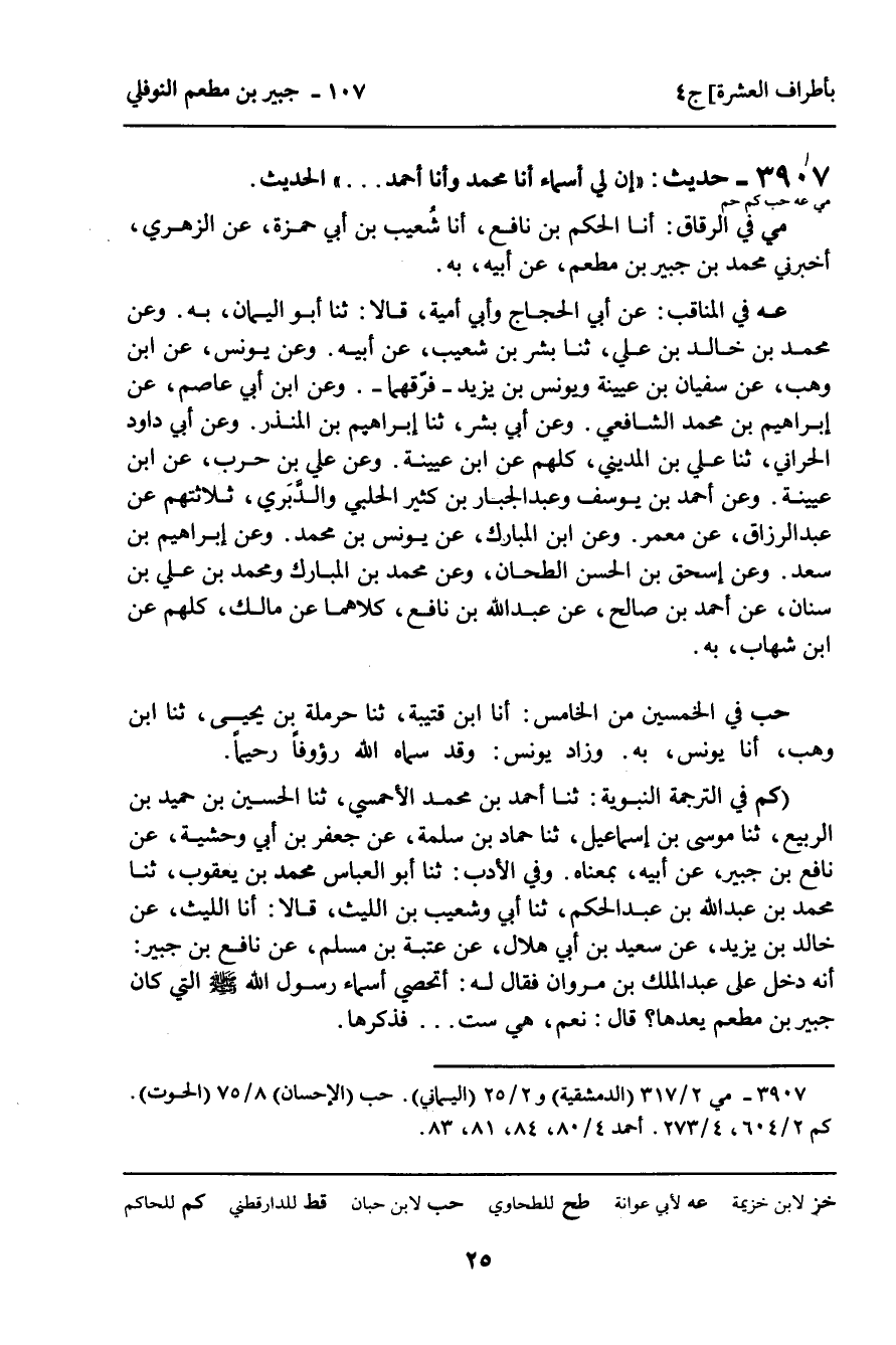 كم فِي التَّرْجَمَةِ النَّبَوِيَّةِ: ثنا أَحْمَدُ بْنُ مُحَمَّدٍ الأَحْمَسِيُّ، ثنا الْحُسَيْنُ بْنُ حُمَيْدِ بْنِ الرَّبِيعِ، ثنا مُوسَى بْنِ إِسْمَاعِيلَ، ثنا حَمَّادُ بْنُ سَلَمَةَ، عَنْ جَعْفَرِ بْنِ أَبِي وَحْشِيَّةَ، عَنْ نَافِعِ بْنِ جُبَيْرٍ، عَنْ أَبِيهِ، بِمَعْنَاهُ. وَفِي الأَدَبِ: ثنا أَبُو الْعَبَّاسِ مُحَمَّدُ بْنُ يَعْقُوبَ، ثنا مُحَمَّدُ بْنُ عَبْدِ اللَّهِ بْنِ عَبْدِ الْحَكَمِ، ثنا أَبِي وَشُعَيْبُ بْنُ اللَّيْثِ، قَالا: أنا اللَّيْثُ، عَنْ خَالِدِ بْنِ يَزِيدَ، عَنْ سَعِيدِ بْنِ أَبِي هِلالٍ، عَنْ عُتْبَةَ بْنِ مُسْلِمٍ، عَنْ نَافِعِ بْنِ جُبَيْرٍ: أَنَّهُ دَخَلَ عَلَى عَبْدِ الْمَلِكِ بْنِ مَرْوَانَ فَقَالَ لَهُ: أَتُحْصِي أَسْمَاءَ رَسُولِ اللَّهِ صَلَّى اللَّهُ عَلَيْهِ وَسَلَّمَ الَّتِي كَانَ جُبَيْرُ بْنُ مُطْعِمٍ يَعُدُّهَا؟ قَالَ: نَعَمْ، هِيَ سِتٌّ. . . فَذَكَرَهَا.