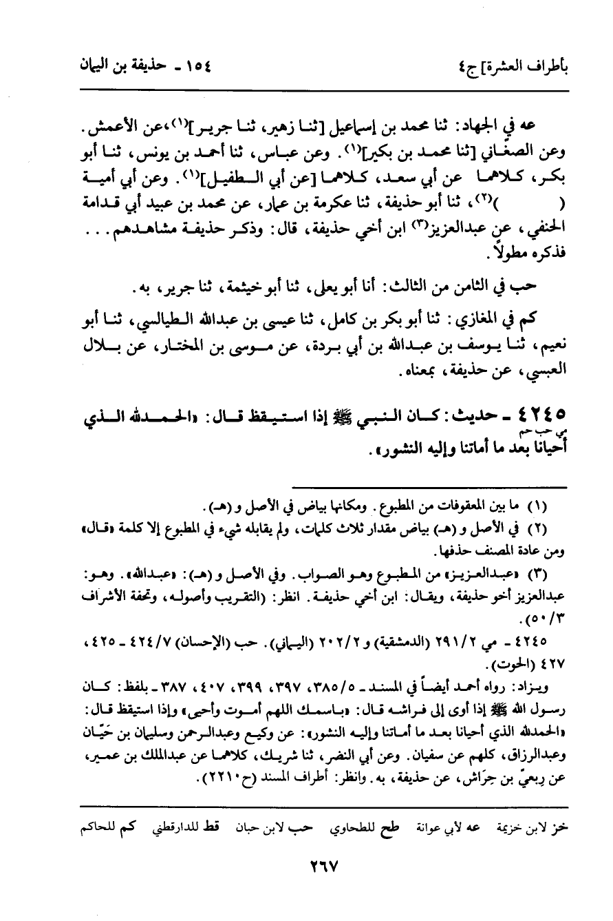 4245 - حَدِيثٌ (مي حب حم) : " كَانَ النَّبِيُّ صَلَّى اللَّهُ عَلَيْهِ وَسَلَّمَ إِذَا اسْتَيْقَظَ قَالَ " الْحَمْدُ للَّهِ الَّذِي أَحْيَانَا بَعْدَمَا أَمَاتَنَا وَإِلَيْهِ النُّشُورُ "
