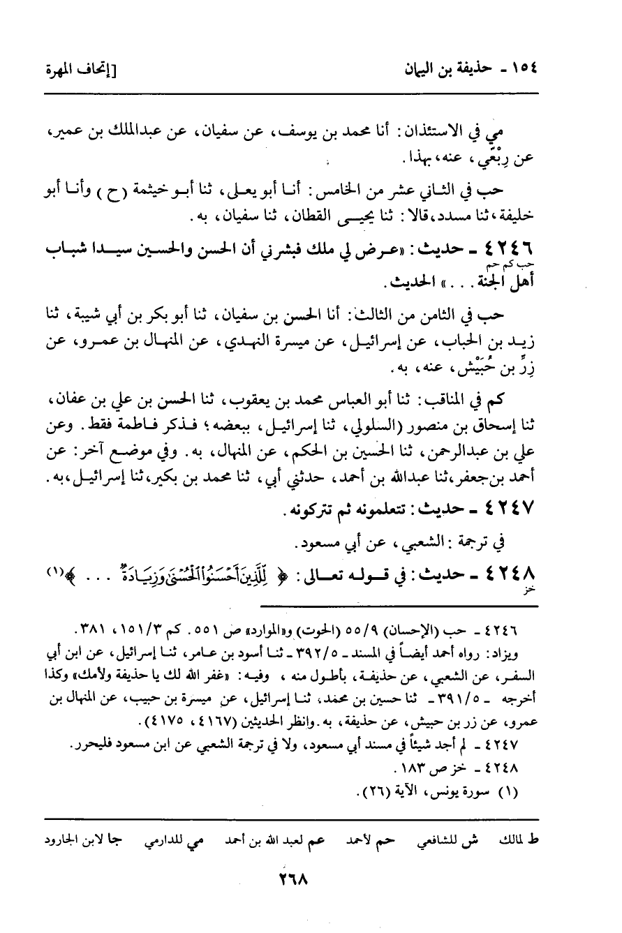 حب فِي الثَّامِنِ مِنَ الثَّالِثِ: أنا الْحَسَنُ بْنُ سُفْيَانَ، ثنا أَبُو بَكْرِ بْنُ أَبِي شَيْبَةَ، ثنا زَيْدُ بْنُ الْحُبَابِ، عَنْ إِسْرَائِيلَ، عَنْ مَيْسَرَةَ النَّهْدِيِّ، عَنِ الْمِنْهَالِ بْنِ عَمْرٍو، عَنْ زِرِّ بْنِ حُبَيْشٍ، عَنْهُ، بِهِ.