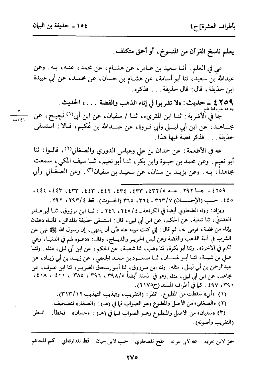 4259 - حَدِيثٌ (جا عه حب قط طح) : " لا تَشْرَبُوا فِي إِنَاءِ الذَّهَبِ وَالْفِضَّةِ. . . " الْحَدِيثَ.