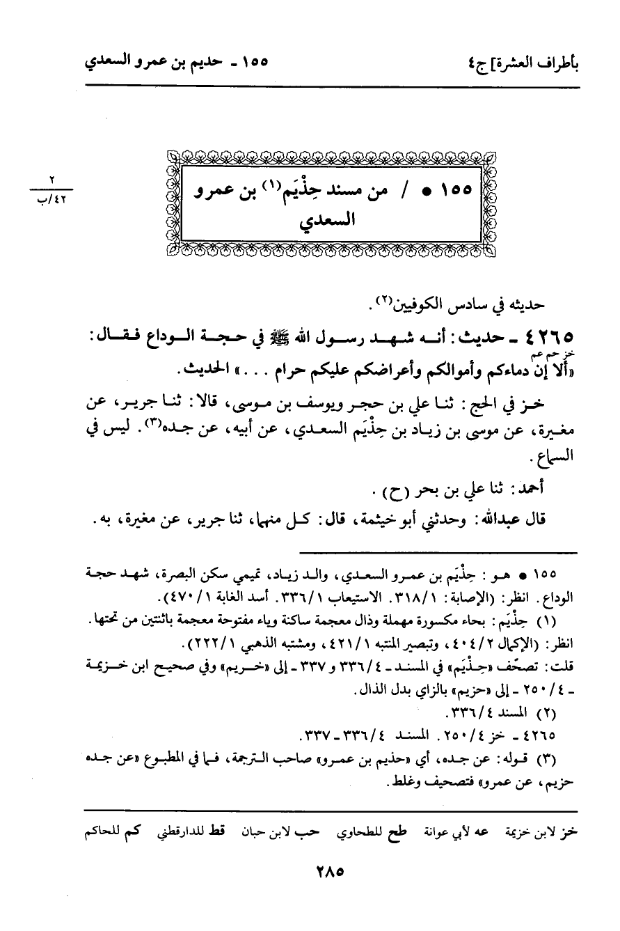 4265 - حَدِيثٌ (خز حم عم) : " أَنَّهُ شَهِدَ رَسُولَ اللَّهِ صَلَّى اللَّهُ عَلَيْهِ وَسَلَّمَ فِي حَجَّةِ الْوَدَاعِ فَقَالَ: " أَلا إِنَّ دِمَاءَكُمْ وَأَمْوَالَكُمْ وَأَعْرَاضَكُمْ عَلَيْكُمْ حَرَامٌ. . . " الْحَدِيثَ. خز فِي الْحَجِّ: ثنا عَلِيُّ بْنُ حُجْرٍ، وَيُوسُفُ بْنُ مُوسَى، قَالا: ثنا جَرِيرٌ، عَنْ مُغِيرَةَ، عَنْ مُوسَى بْنِ زِيَادِ بْنِ حِذْيَمٍ السَّعْدِيِّ، عَنْ أَبِيهِ، عَنْ جَدِّهِ. لَيْسَ فِي السَّمَاعِ. أَحْمَدُ: ثنا عَلِيُّ بْنُ بَحْرٍ ح. قَالَ عَبْدُ اللَّهِ: وَحَدَّثَنِي أَبُو خَيْثَمَةَ، قَالَ: كُلٌّ مِنْهُمَا، ثنا جَرِيرٌ، عَنْ مُغِيرَةَ، بِهِ.