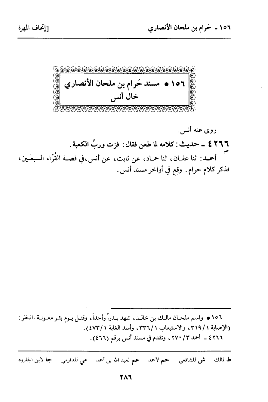 156 ـ مُسْنَدُ حَرَامِ بْنِ مِلْحَانَ الأَنْصَارِيِّ خَالِ أَنَسٍ