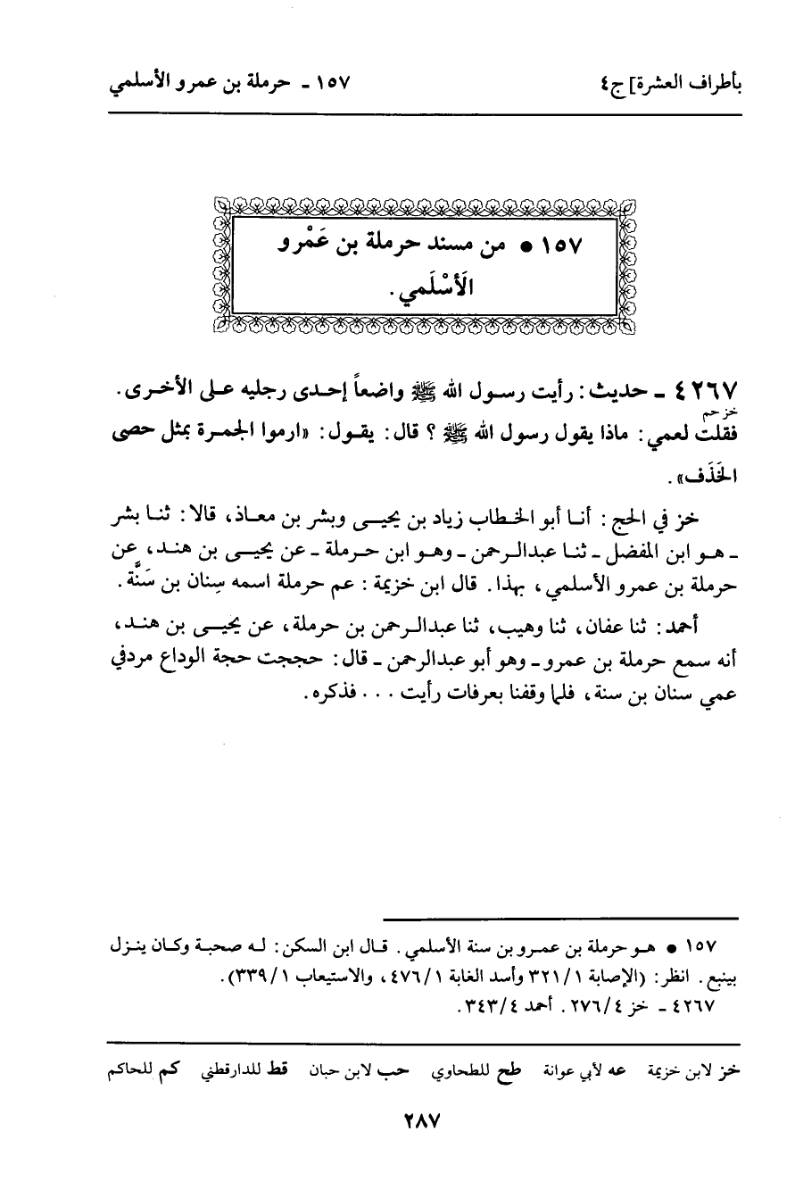 4267 - حَدِيثٌ (خز حم) : " رَأَيْتُ رَسُولَ اللَّهِ صَلَّى اللَّهُ عَلَيْهِ وَسَلَّمَ وَاضِعًا إِحْدَى رِجْلَيْهِ عَلَى الأُخْرَى. فَقُلْتُ لِعَمِّي: مَاذَا يَقُولُ رَسُولُ اللَّهِ صَلَّى اللَّهُ عَلَيْهِ وَسَلَّمَ؟ قَالَ: يَقُولُ: " ارْمُوا الْجَمْرَةَ بِمِثْلِ حَصَى الْخَذْفِ ". خز فِي الْحَجِّ: أنا أَبُو الْخَطَّابِ زِيَادُ بْنُ يَحْيَى، وَبِشْرُ بْنُ مُعَاذٍ، قَالا: ثنا بِشْرٌ هُوَ ابْنُ الْمُفَضَّلِ، ثنا عَبْدُ الرَّحْمَنِ هُوَ ابْنُ حَرْمَلَةَ، عَنْ يَحْيَى بْنِ هِنْدٍ، عَنْ حَرْمَلَةَ بْنِ عَمْرٍو الأَسْلَمِيِّ، بِهَذَا. قَالَ ابْنُ خُزَيْمَةَ. عَمُّ حَرْمَلَةَ اسْمُهُ سِنَانُ بْنُ سَنَّةَ. أَحْمَدُ: ثنا عَفَّانُ، ثنا وُهَيْبٌ، ثنا عَبْدُ الرَّحْمَنِ بْنُ حَرْمَلَةَ، عَنْ يَحْيَى بْنِ هِنْدٍ، أَنَّهُ سَمِعَ حَرْمَلَةَ بْنَ عَمْرٍو وَهُوَ أَبُو عَبْدِ الرَّحْمَنِ، قَالَ: حَجَجْتُ حَجَّةَ الْوَدَاعِ مُرْدِفِي عَمِّي سِنَانُ بْنُ سَنَّةَ، فَلَمَّا وَقَفْنَا بِعَرَفَاتٍ رَأَيْتُ. . . فَذَكَرَهُ.