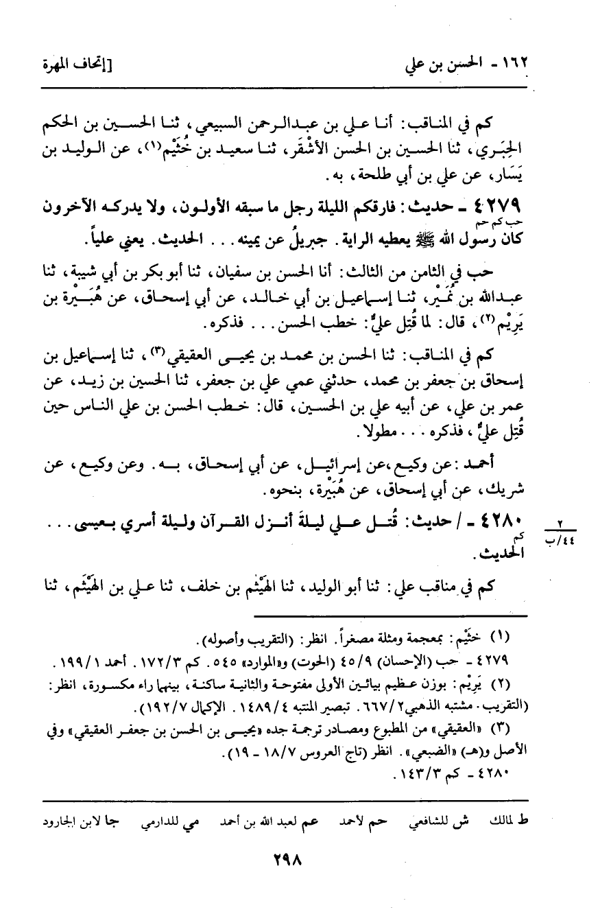 4279 - حَدِيثٌ (حب كم حم) : " فَارَقَكُمُ اللَّيْلَةَ رَجُلٌ مَا سَبَقَهُ الأَوَّلُونَ وَلا يُدْرِكُهُ الآخِرُونَ كَانَ رَسُولُ اللَّهِ صَلَّى اللَّهُ عَلَيْهِ وَسَلَّمَ يُعْطِيهِ الرَّايَةَ. جِبْرِيلُ عَنْ يَمِينِهِ. . . " , الْحَدِيثَ. يَعْنِي عَلِيًّا. حب فِي الثَّامِنِ مِنَ الثَّالِثِ: أنا الْحَسَنُ بْنُ سُفْيَانَ، ثنا أَبُو بَكْرِ بْنُ أَبِي شَيْبَةَ، ثنا عَبْدُ اللَّهِ بْنُ نُمَيْرٍ، ثنا إِسْمَاعِيلُ بْنُ أَبِي خَالِدٍ، عَنْ أَبِي إِسْحَاقَ، عَنْ هُبَيْرَةَ بْنِ يَرِيمَ، قَالَ: لَمَّا قُتِلَ عَلِيٌّ: خَطَبَ الْحَسَنُ. . . فَذَكَرَهُ. كم فِي الْمَنَاقِبِ: ثنا الْحَسَنُ بْنُ مُحَمَّدِ بْنِ يَحْيَى الْعَقِيقِيُّ، ثنا إِسْمَاعِيلُ بْنُ إِسْحَاقَ بْنِ جَعْفَرِ بْنِ مُحَمَّدٍ، حَدَّثَنِي عَمِّي ابْنُ جَعْفَرٍ، ثنا الْحُسَيْنُ بْنُ زَيْدٍ، عَنْ عُمَرَ بْنِ عَلِيٍّ، عَنْ أَبِي عَلِيِّ بْنِ الْحُسَيْنِ، قَالَ خَطَبَ الْحَسَنُ بْنُ عَلِيٍّ النَّاسَ حِينَ قُتِلَ عَلِيٌّ، فَذَكَرَهُ. . . مُطَوَّلا. أَحْمَدُ: عَنْ وَكِيعٍ، عَنْ إِسْرَائِيلَ، عَنْ أَبِي إِسْحَاقَ، بِهِ. وَعَنْ وَكِيعٍ، عَنْ شَرِيكٍ، عَنْ أَبِي إِسْحَاقَ، عَنْ هُبَيْرَةَ، بِنَحْوِهِ.