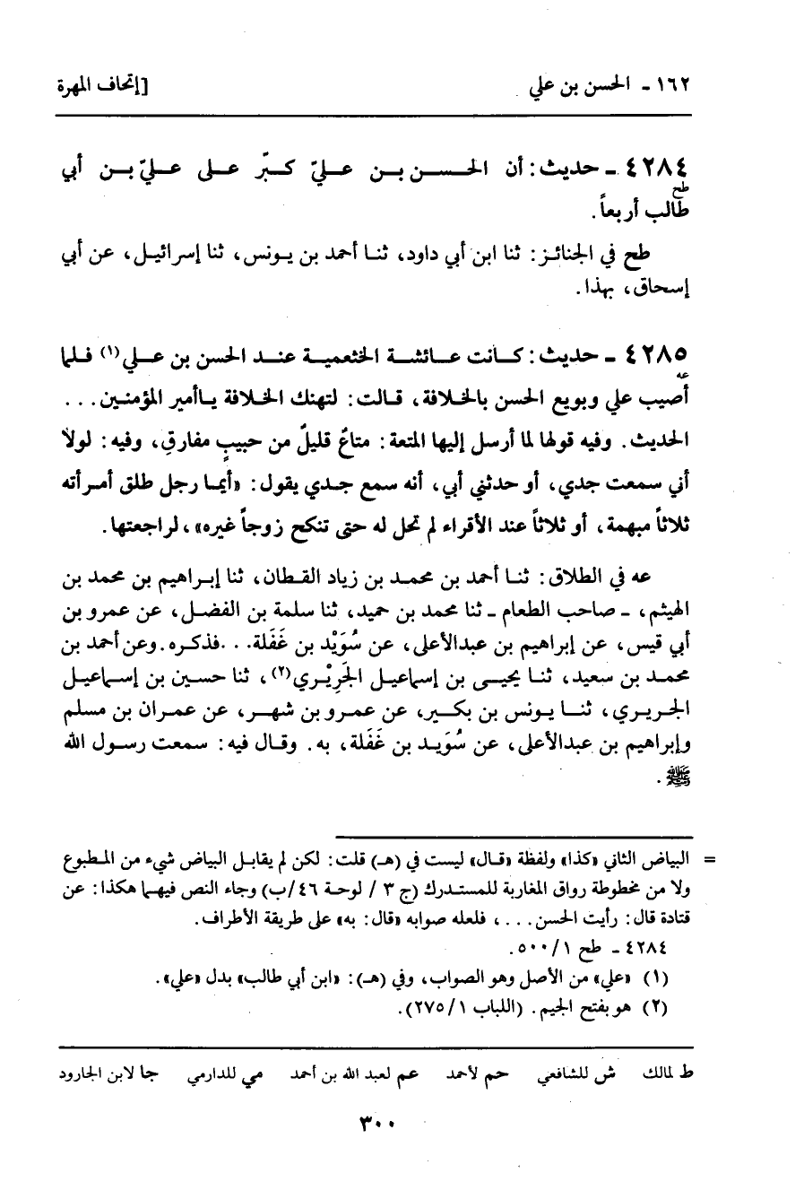 4285 - حَدِيثٌ (عه) : " كَانَتْ عَائِشَةُ الْخَثْعَمِيَّةُ عِنْدَ الْحَسَنِ بْنِ عَلِيٍّ، فَلَمَّا أُصِيبَ عَلِيٌّ وَبُويِعَ الْحَسَنُ بِالْخِلافَةِ، قَالَتْ: لِتُهْنِكَ الْخِلافَةُ يَا أَمِيرَ الْمُؤْمِنِينَ. . . الْحَدِيثَ. وَفِيهِ قَوْلُهَا لَمَّا أَرْسَلَ إِلَيْهَا الْمُتْعَةَ: مَتَاعٌ قَلِيلٌ مِنْ حَبِيبٍ مُفَارِقٍ، وَفِيهِ: لَوْلا أَنِّي سَمِعْتُ جَدِّي، أَوْ حَدَّثَنِي أَبِي، أَنَّهُ سَمِعَ جَدِّي يَقُولُ: " أَيُّمَا رَجُلٍ طَلَّقَ امْرَأَتَهُ ثَلاثًا مُبْهَمَةً، أَوْ ثَلاثًا عِنْدَ الأَقْرَاءِ لَمْ تَحِلَّ لَهُ حَتَّى تَنْكِحَ زَوْجًا غَيْرَهُ " , لَرَاجَعْتُهَا. عه فِي الطَّلاقِ: ثنا أَحْمَدُ بْنُ مُحَمَّدِ بْنِ زِيَادٍ الْقَطَّانُ، ثنا إِبْرَاهِيمُ بْنُ مُحَمَّدِ بْنِ الْهَيْثَمِ صَاحِبُ الطَّعَامِ، ثنا مُحَمَّدُ بْنُ حُمَيْدٍ، ثنا سَلَمَةُ بْنُ الْفَضْلِ، عَنْ عَمْرِو بْنِ أَبِي قَيْسٍ، عَنْ إِبْرَاهِيمَ بْنِ عَبْدِ الأَعْلَى، عَنْ سُوَيْدِ بْنِ غَفَلَةَ. . . فَذَكَرَهُ. وَعَنْ أَحْمَدَ بْنِ مُحَمَّدِ بْنِ سَعِيدٍ، ثنا يَحْيَى بْنُ إِسْمَاعِيلَ الْجَرِيرِيُّ، ثنا حُسَيْنُ بْنُ إِسْمَاعِيلَ الْجَرِيرِيُّ، ثنا يُونُسُ بْنُ بُكَيْرٍ، عَنْ عَمْرِو بْنِ شَهْرٍ، عَنْ عِمْرَانَ بْنِ مُسْلِمٍ، وَإِبْرَاهِيمَ بْنِ عَبْدِ الأَعْلَى، عَنْ سُوَيْدِ بْنِ غَفَلَةَ، بِهِ. وَقَالَ فِيهِ: سَمِعْتُ رَسُولَ اللَّهِ صَلَّى اللَّهُ عَلَيْهِ وَسَلَّمَ.